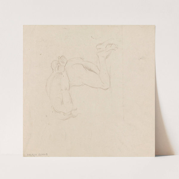 This is a delicately rendered pencil sketch titled "Knelende mann" by Adolph Tidemand. The artwork depicts a man reclining on his back, with one leg bent at the knee and the other extended upwards. His head rests on what appears...