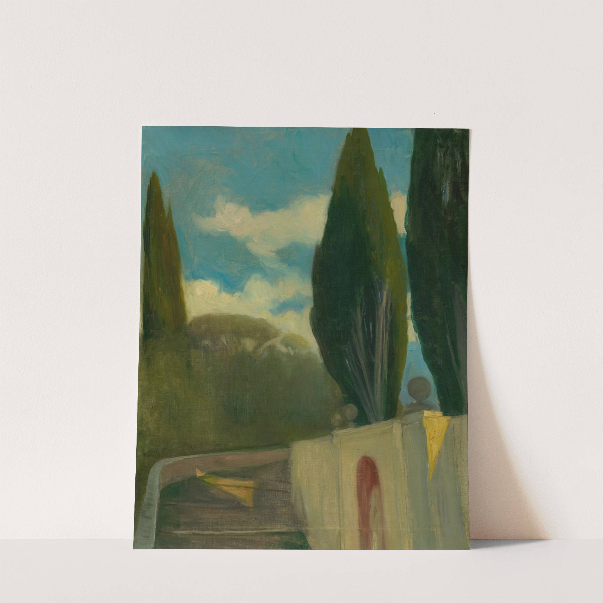 Experience the serene beauty of "Krajina" by Ákos Aranyossy, a captivating oil painting on canvas that blends natural elements with architectural elegance. The composition features towering, dark green cypress trees that stand majestically against a vivid sky, where swirling clouds...