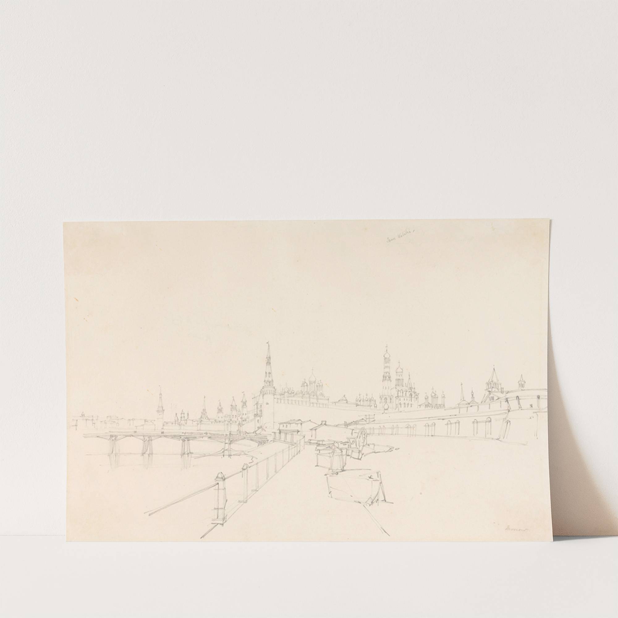 This art print features "Kremlin from the Quay" by Alfred Gomersal Vickers, rendered in a minimalist black-and-white line drawing style. The intricate sketch depicts the iconic architecture of the Kremlin, highlighting its towers and structures against a stark white background....