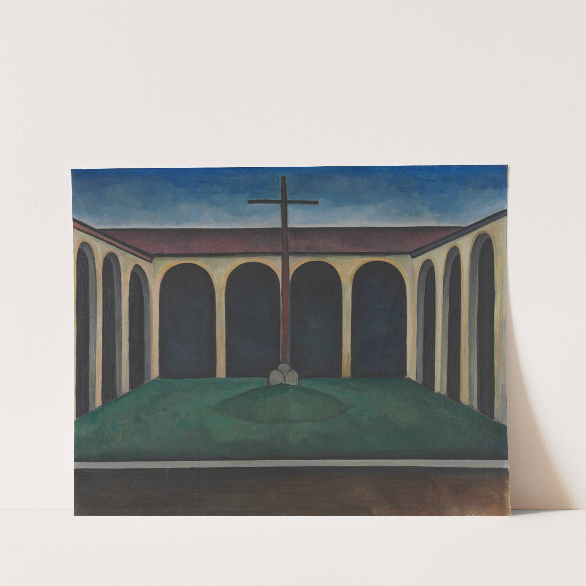 This painting, "Kreuzgang I (1913)" by Alexander Kanoldt, presents a striking and contemplative scene of a cloister. The composition features a series of evenly spaced arches forming the exterior walls of a building, painted in soft white tones which contrast...