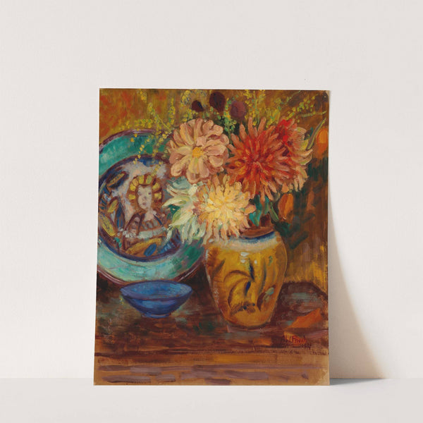 This vibrant art print captures the essence of a colorful still life scene, rendered in an expressive, impressionistic style. The centerpiece features two vividly colored vases—one a deep blue with a subtle swirl pattern and the other a warm yellow...