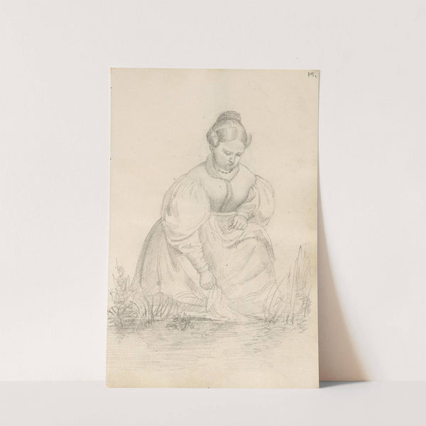 This art print features "Kvinne på huk i gresset" (Woman on Her Knees in the Grass) by Adolph Tidemand, a classic piece from 1835. Rendered in delicate pencil sketches, this monochromatic artwork showcases a woman with soft curves and delicate...