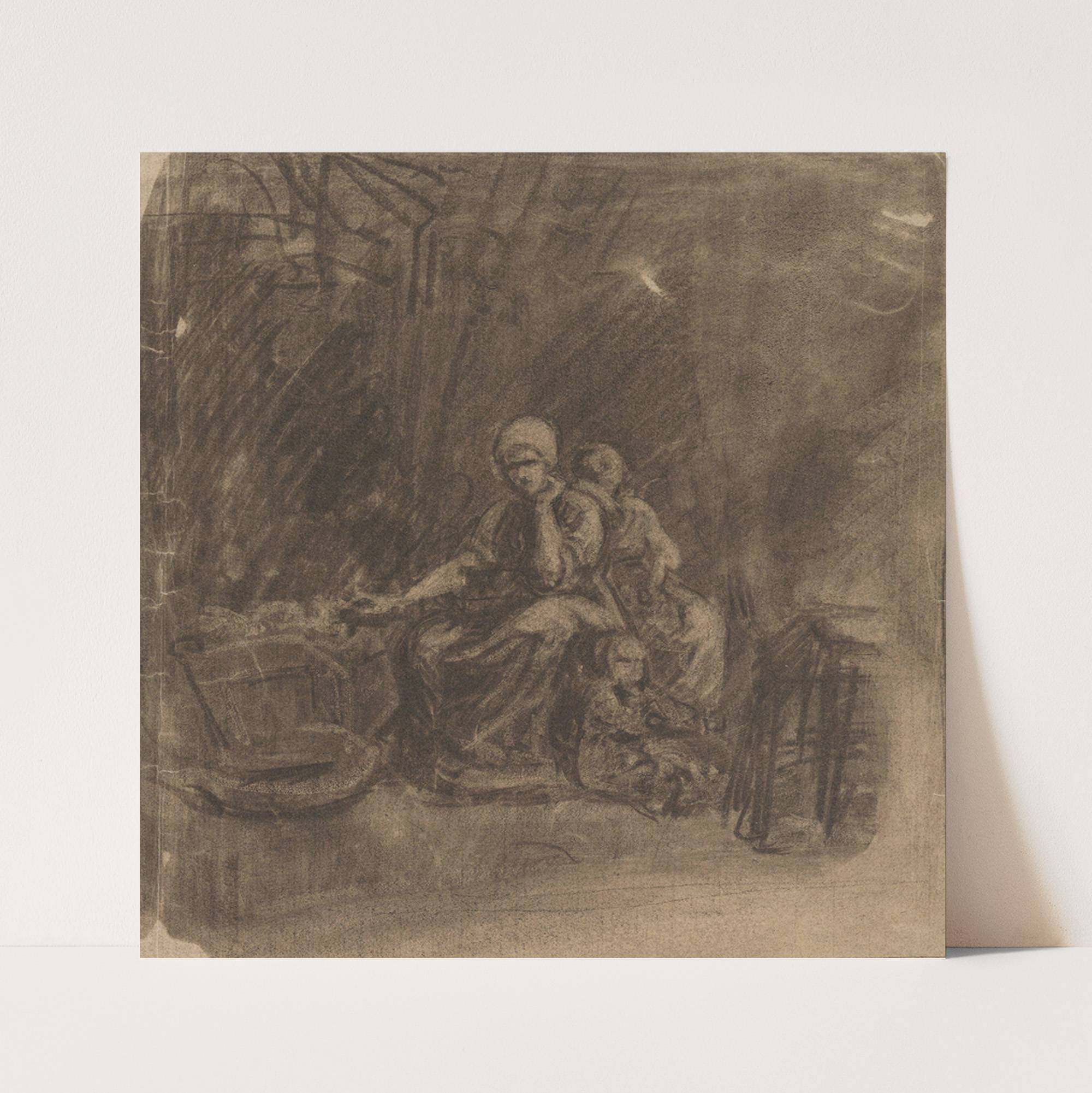 This monochromatic drawing, "Kvinner med barn og krybbe" (Women with Children and Cradle) by Adolph Tidemand, features a poignant scene of tender family interaction. The artist employs soft, fluid lines and a muted sepia tone to create an emotionally rich...