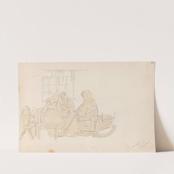 This delicate sketch captures a tender moment featuring three women seated in a cozy, rustic setting. Rendered in soft, sepia tones, the drawing exudes warmth and tranquility. The woman on the left appears to be breastfeeding her child, whose small...