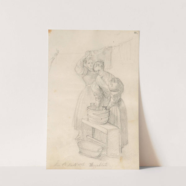 This black-and-white pencil drawing depicts two women engaged in cooking activity, characterized by its delicate and realistic style. The woman on the left is slightly taller, with her head tilted upward as she adjusts her hair, while the woman on...
