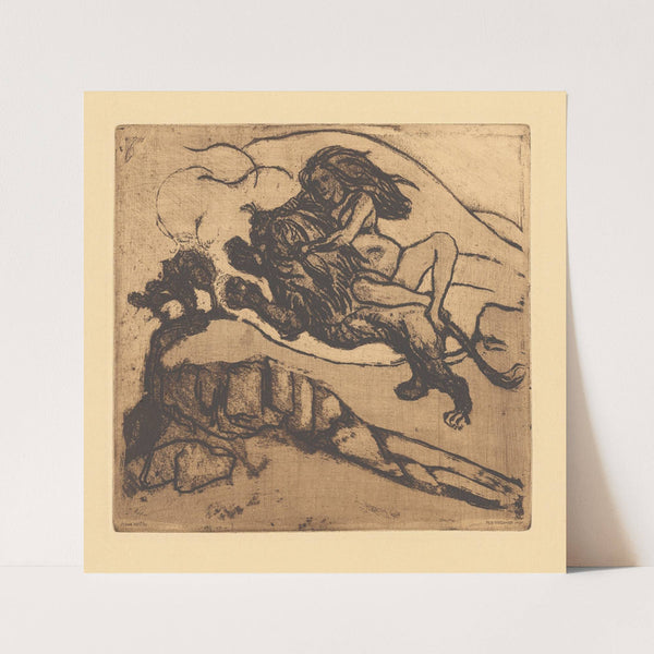 This art print features "Kybele" by Albert Welti, showcasing a dynamic and expressive black ink drawing on a textured beige background. The composition captures two figures in an intimate, intertwined embrace. The central figure appears to be a woman with...