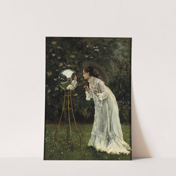 This beautiful art print features "La Boule Argentée" by Alfred Stevens, a classic painting rich with Victorian elegance. The scene portrays a woman in an exquisite white, lace-trimmed dress standing on verdant grass amidst lush greenery. She is intently gazing...