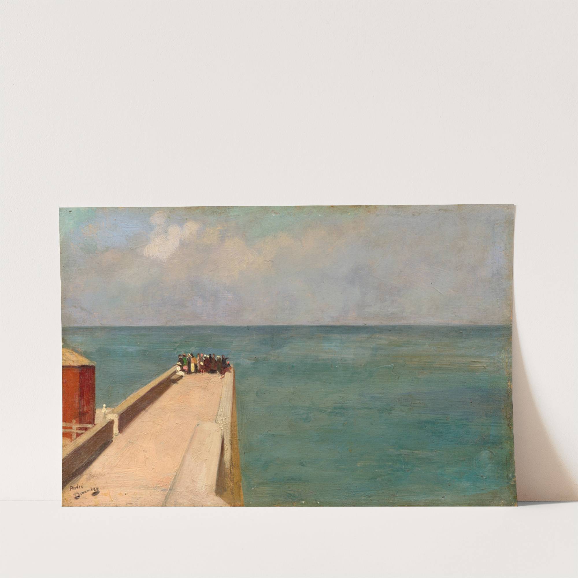 This artwork is a captivating photograph by André Devambez titled "La jetée." It captures a long pier extending into the vast expanse of a calm, teal-blue sea under a slightly cloudy sky. The pier, made of light beige concrete, creates...
