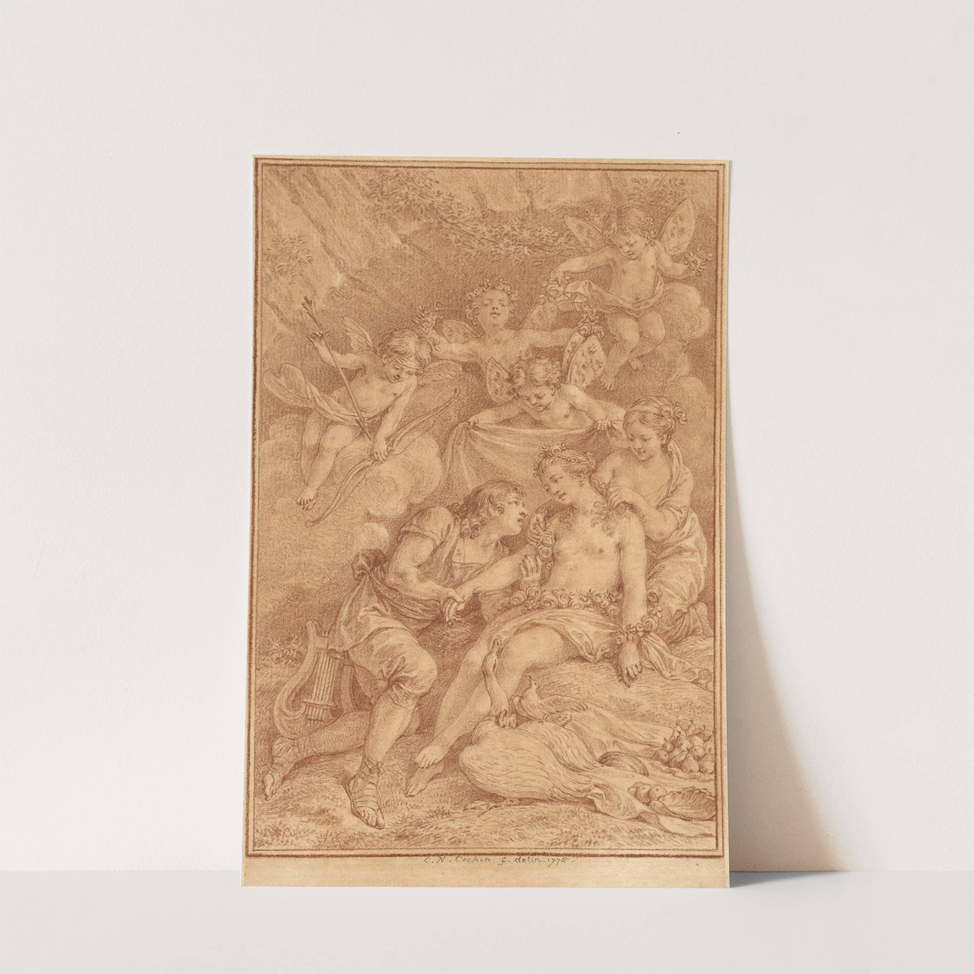 L’Amour va blesser Charite qui regarde Vénus et Péristère rassure les Nicéennes qui vont céder aux bergers conduits par l’Amour by Charles Nicolas Cochin II - Wall Art Print
