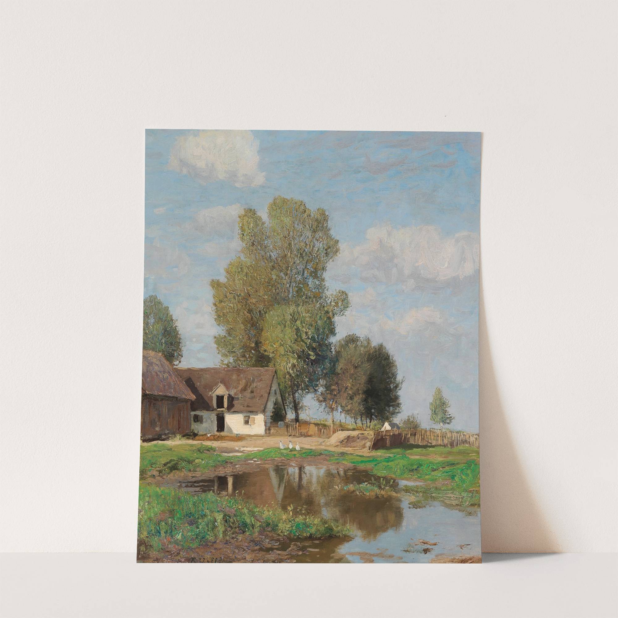 Experience the charm of rural life with this beautiful print titled "Ländliche Idylle" by Alfred Zoff. This piece captures the serene beauty of a countryside scene, characterized by its tranquil reflection in the small pond at the forefront. The composition...