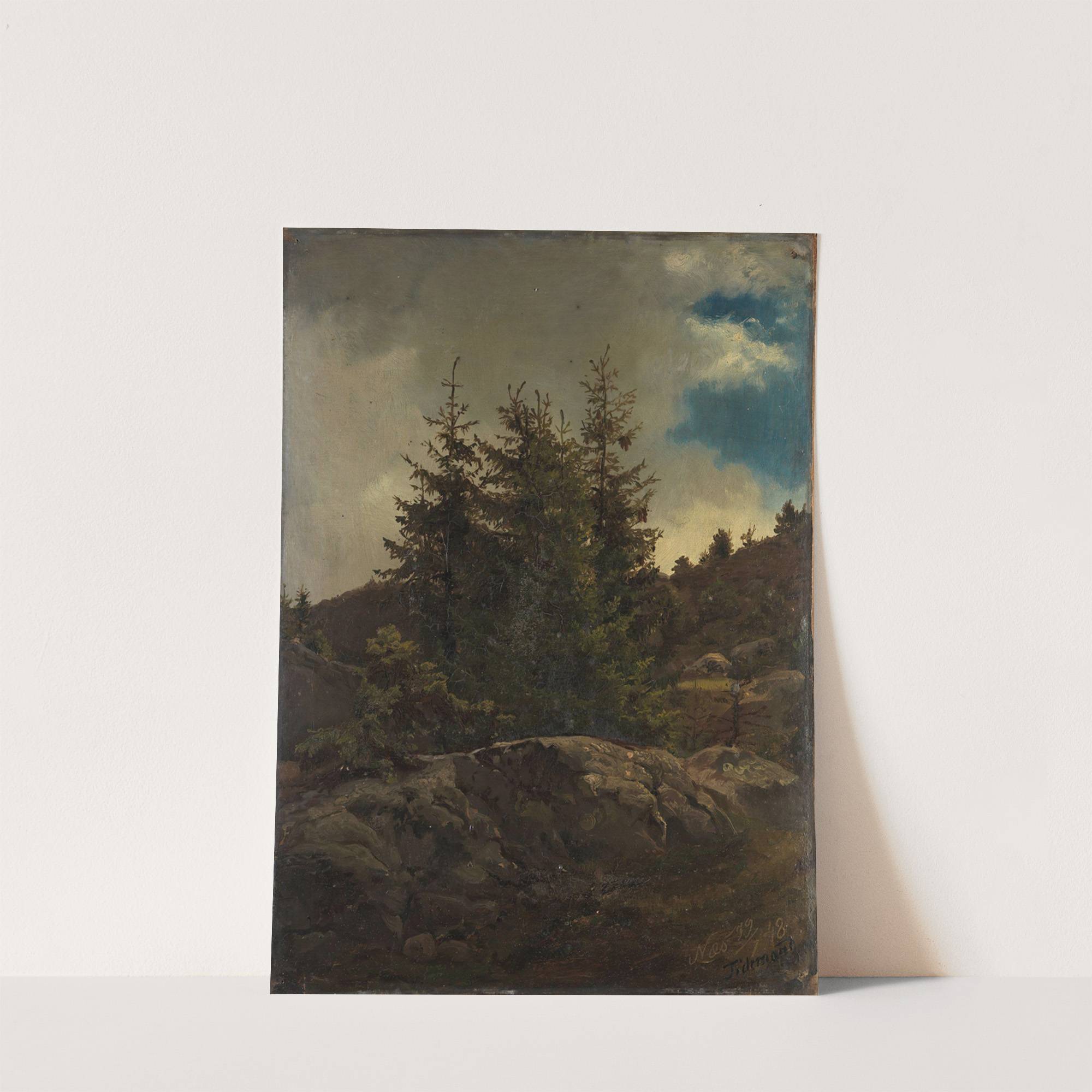 This captivating painting captures a serene landscape scene titled "Landscape from Nes in Hallingdal" by Adolph Tidemand, created in 1848. The composition features towering pine trees silhouetted against a moody sky filled with dramatic cloud patterns. The sky transitions from...