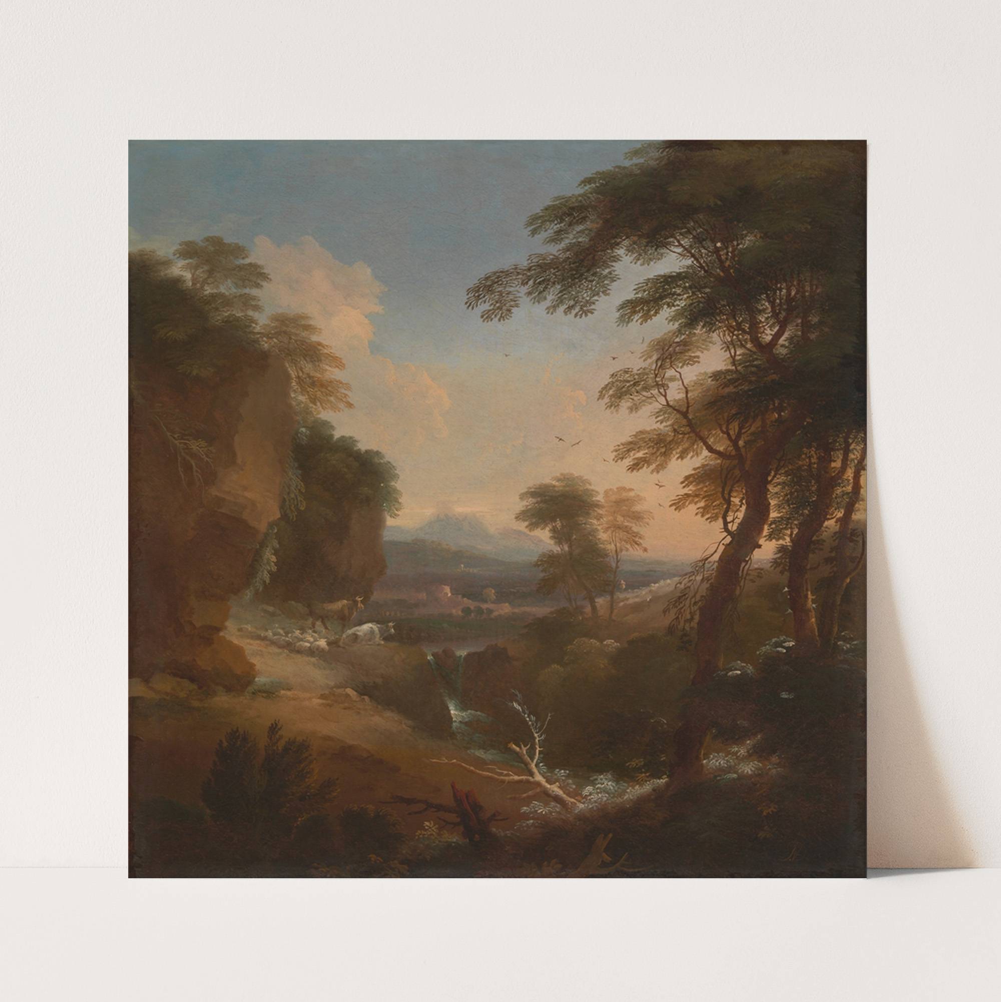 This elegant landscape painting titled "Landscape with Distant Mountains" by the artist Adriaen van Diest showcases a serene, nature-filled vista. The artwork features a picturesque scene bathed in warm, late-afternoon sunlight, creating a tranquil atmosphere. Tall trees with dark green...