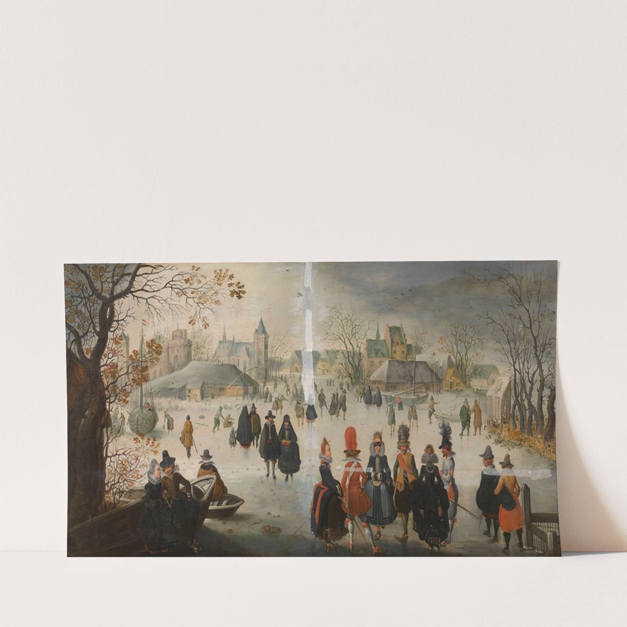 This captivating art print features "Landscape with Skaters" by the renowned artist Adam van Breen. The scene is set in a picturesque winter landscape, where the cold ground is covered in a blanket of snow. In the foreground, a group...