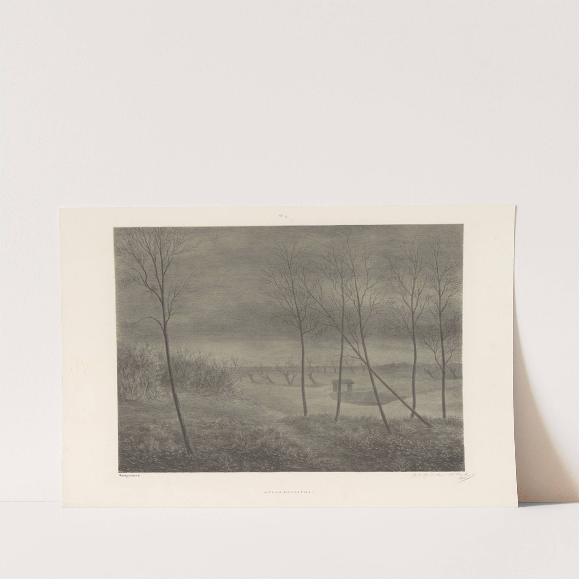 This evocative landscape photograph captures the serene beauty of a quiet countryside scene in monochromatic tones. The central focus is on several slender, leafless trees that stand tall against a softly illuminated background. Their thin branches create delicate, intricate patterns...