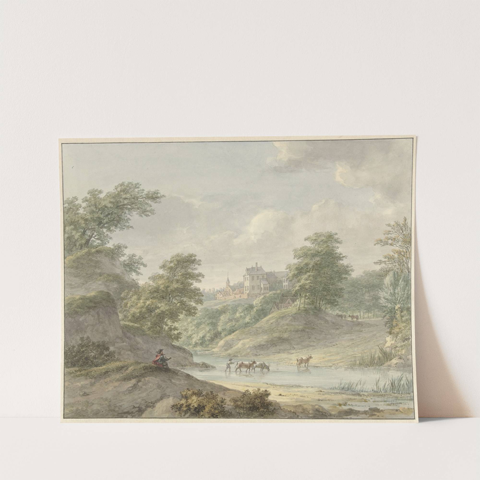 Landschap met zittende tekenaar en kasteel aan water by Hermanus Numan - Wall Art Print