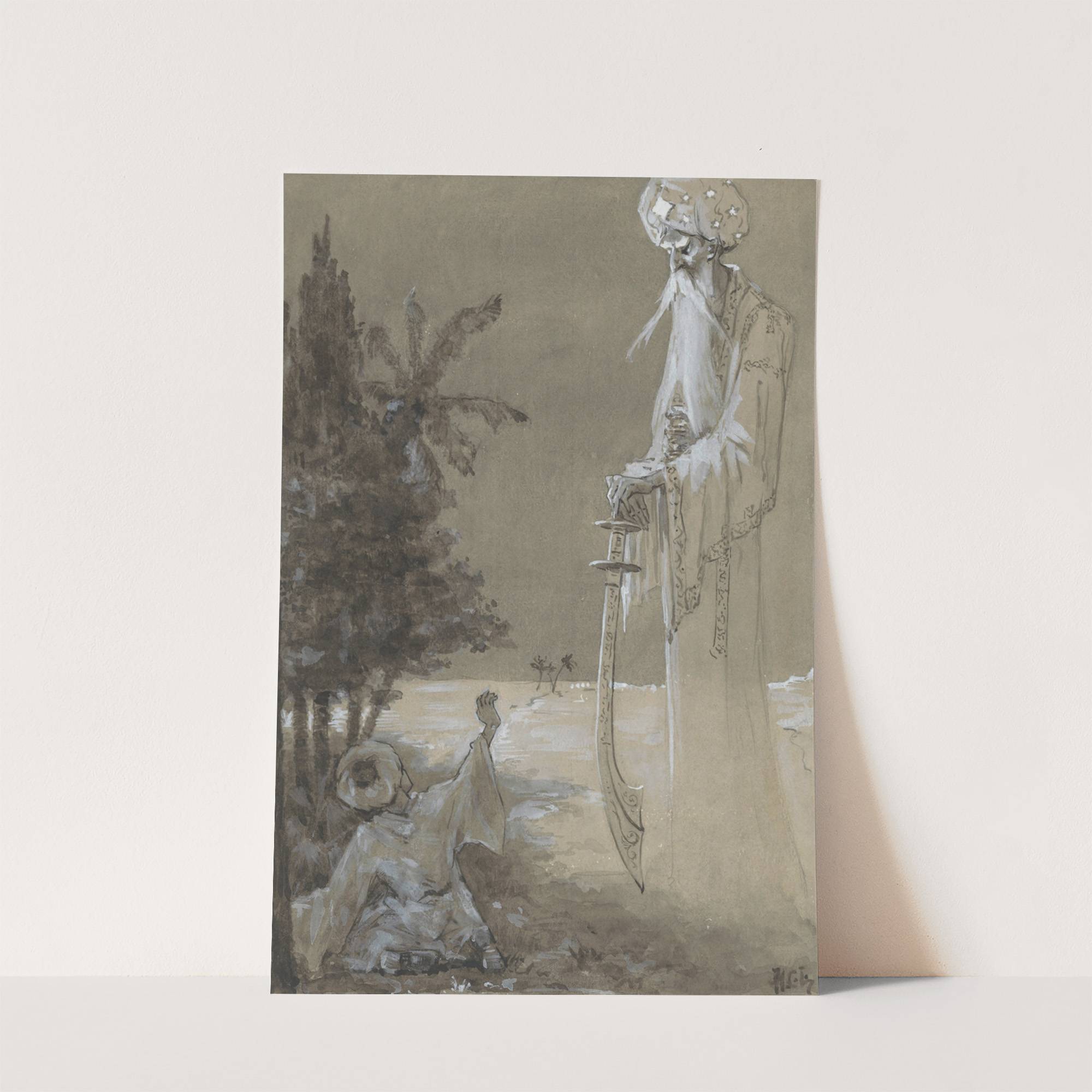 Lange man met baard kijkt neer op een zittende jongen by H.C. Louwerse - Wall Art Print