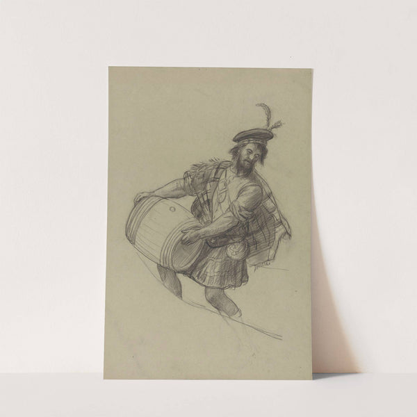 This intricate drawing captures "Lanseknekt med tønne i armene" by the renowned artist Adolph Tidemand. Rendered in monochromatic pencil, this artwork showcases a robust male figure with a full beard and tousled hair, adorned in traditional attire. He wears a...