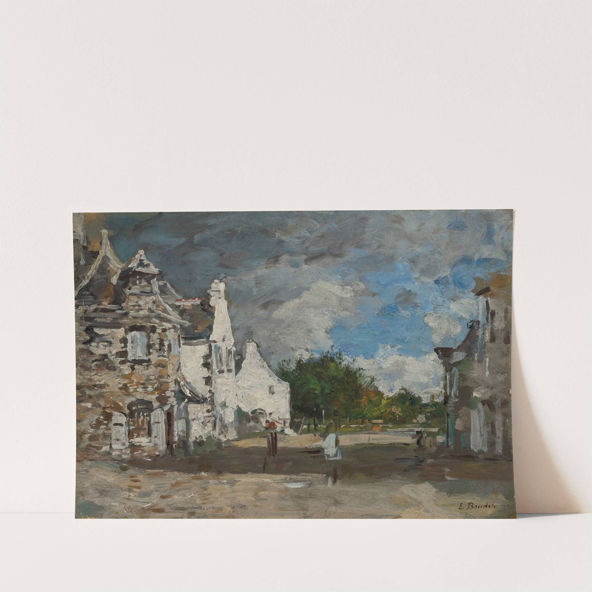 This beautiful art print features "Le Faou, un coin du village" by Eugène Boudin, showcasing an impressionist-style painting of a quaint rural scene. The composition is rich with earthy tones and vivid contrasts, highlighting the architectural beauty of French countryside...