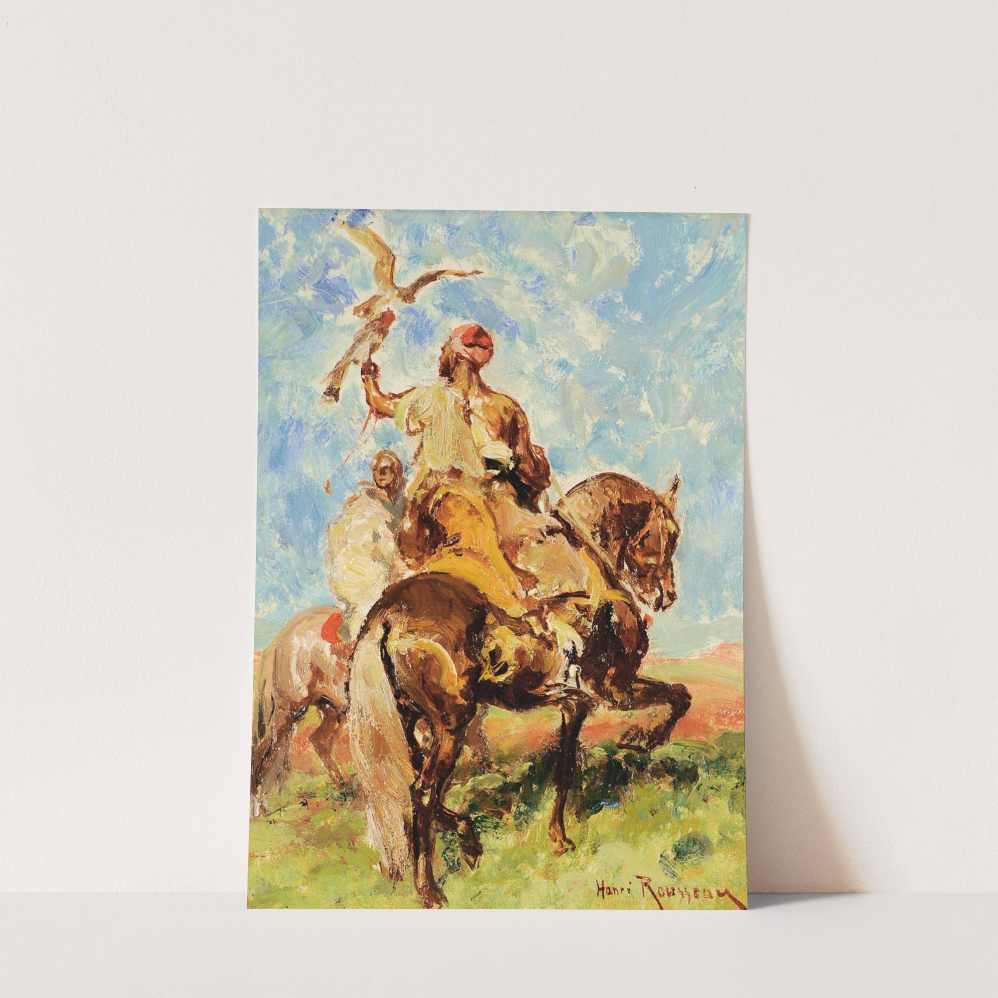 This vibrant painting titled "Le Fauconnier" by Henri Émile Roussel captures an idyllic rural scene with a dynamic mix of colors and textures. In the foreground, two brown horses stand side by side, their sleek coats rendered in rich tones...