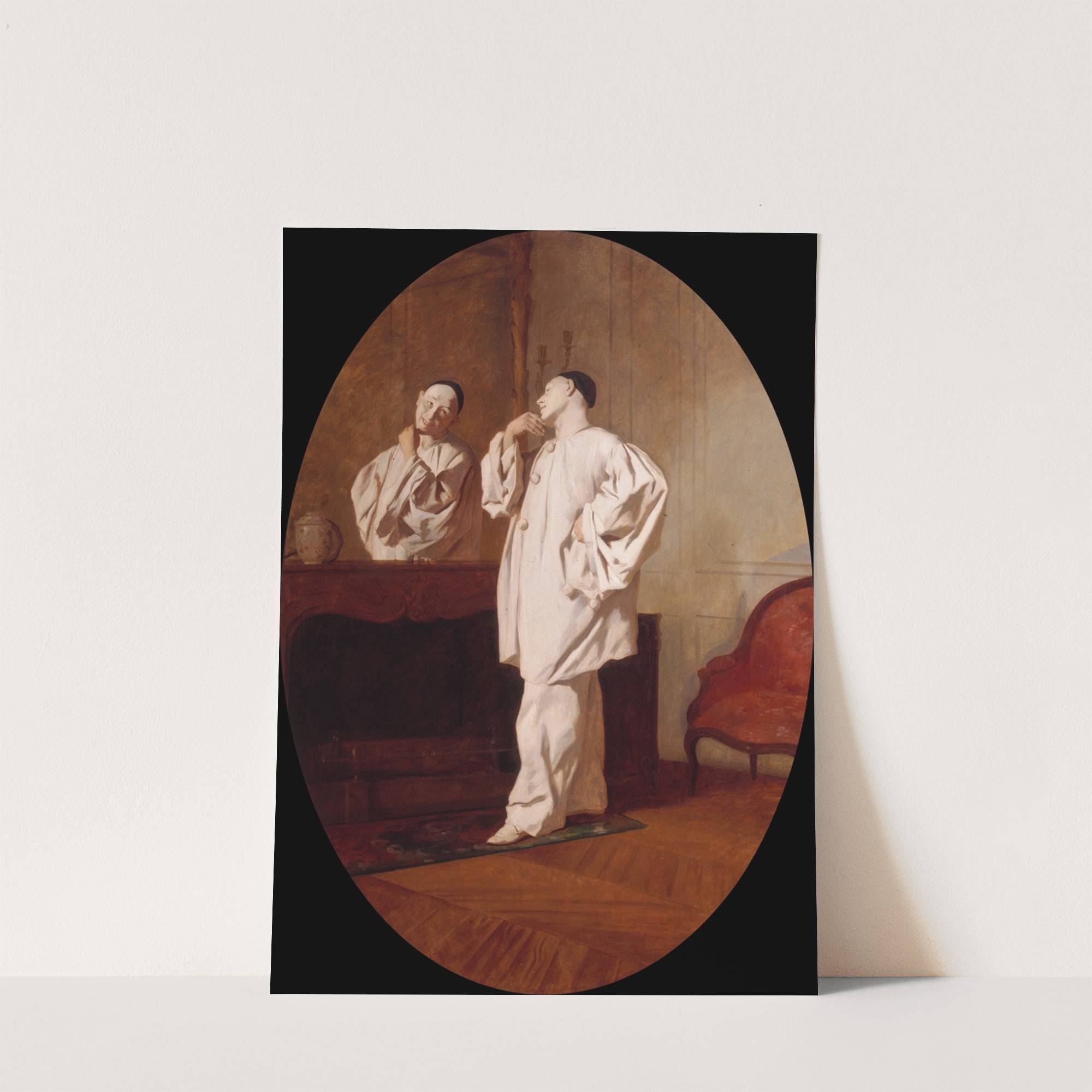 This exquisite art print features "Le Mime Charles Deburau," a portrait of Charles Deburau as Pierrot, created by Jean Pezous in 1850. The artwork showcases two figures within an ornately decorated room. A standing figure, dressed in voluminous white robes,...