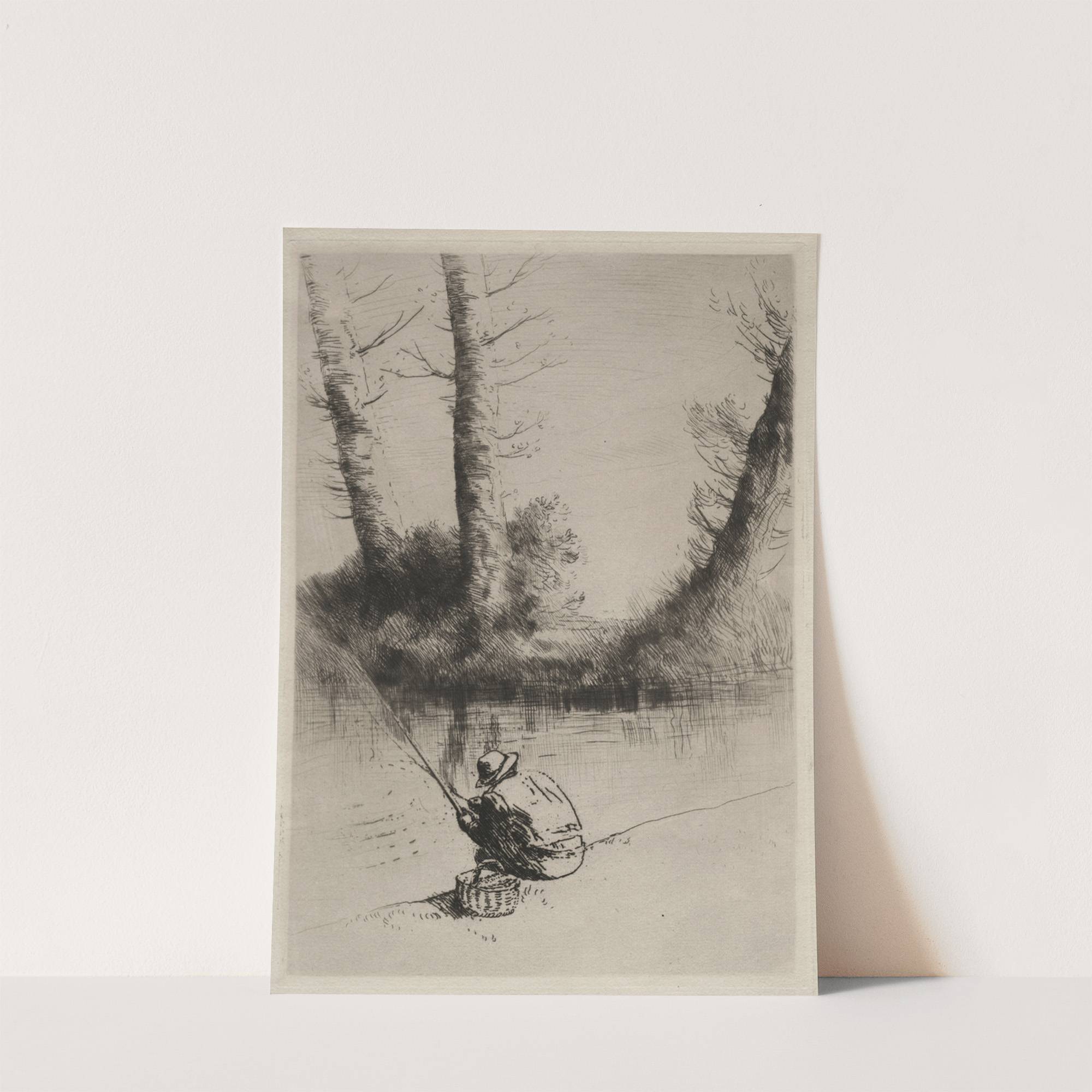 This captivating monochrome etching by Alphonse Legros, titled "Le Pêcheur à la Ligne," presents a tranquil yet poignant scene of a lone fisherman in nature. The artwork employs fine, precise black ink lines to create intricate textures and subtle shading....