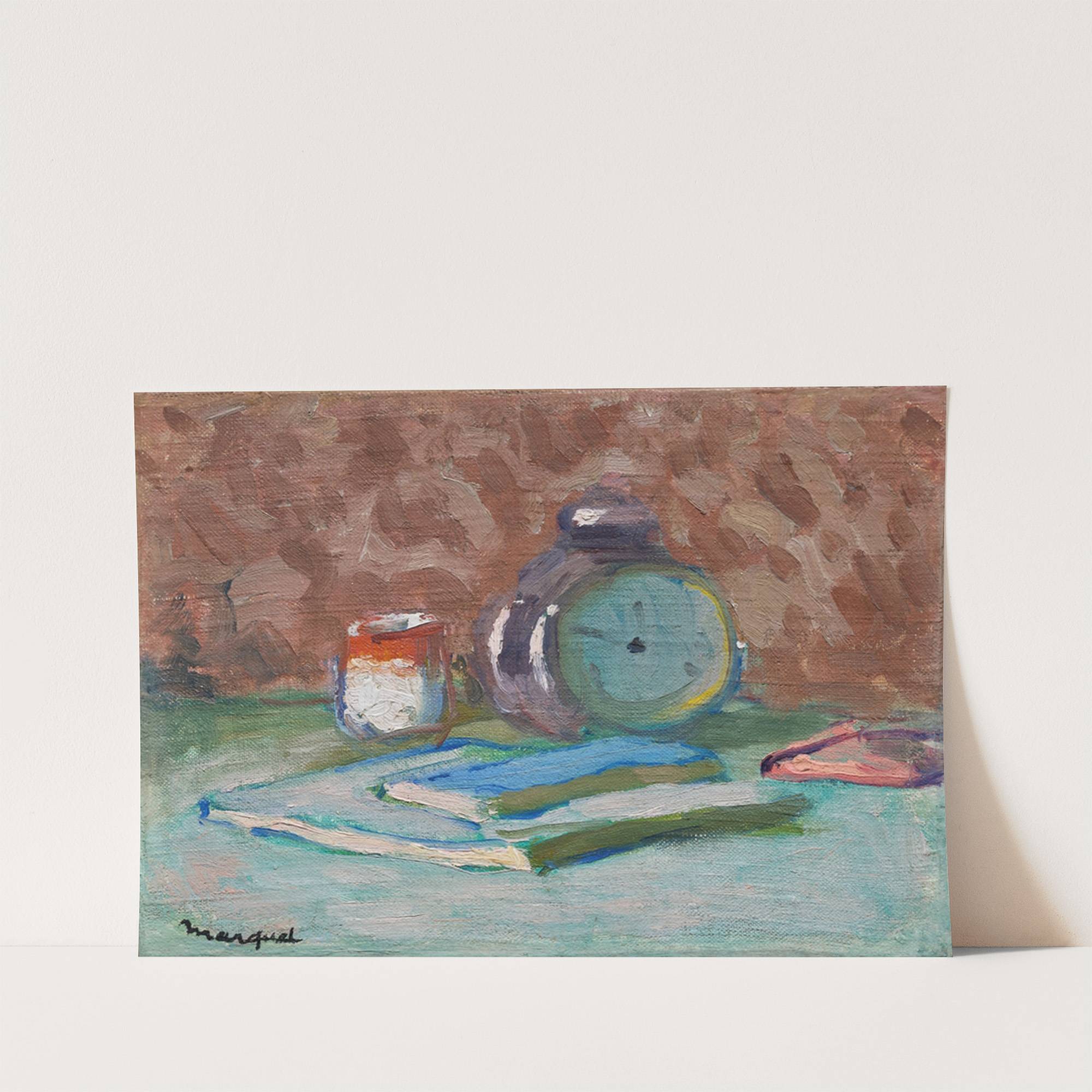 This vibrant art print features "Le Réveil" by Albert Marquet, created in 1895. The painting depicts an evocative still life scene with a modern twist. Dominating the composition is a round alarm clock with a dark, almost black exterior and...