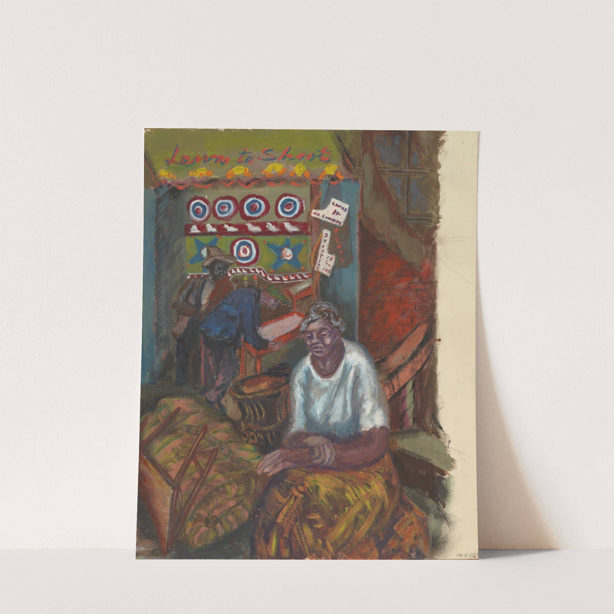 This vibrant and expressive art print features "Learn to Shoot" by artist Agnes Hart. The composition depicts an indoor scene with rich, colorful hues and textured brushwork that brings the subject to life. At the center, a woman with a...