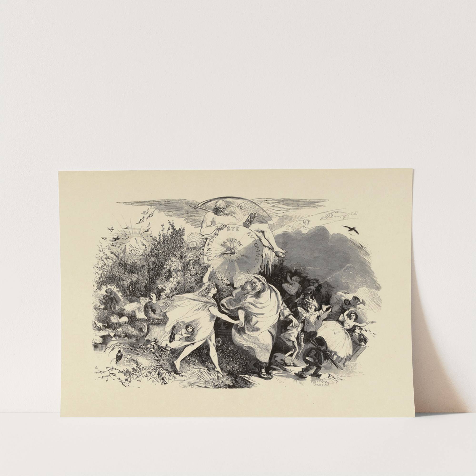 This art print features "Les adieux de l'hiver au printemps" by Edmond Morin, an evocative monochromatic illustration that captures the essence of a transitional season. Central to the composition is a woman adorned in flowing robes, her serene expression illuminated...