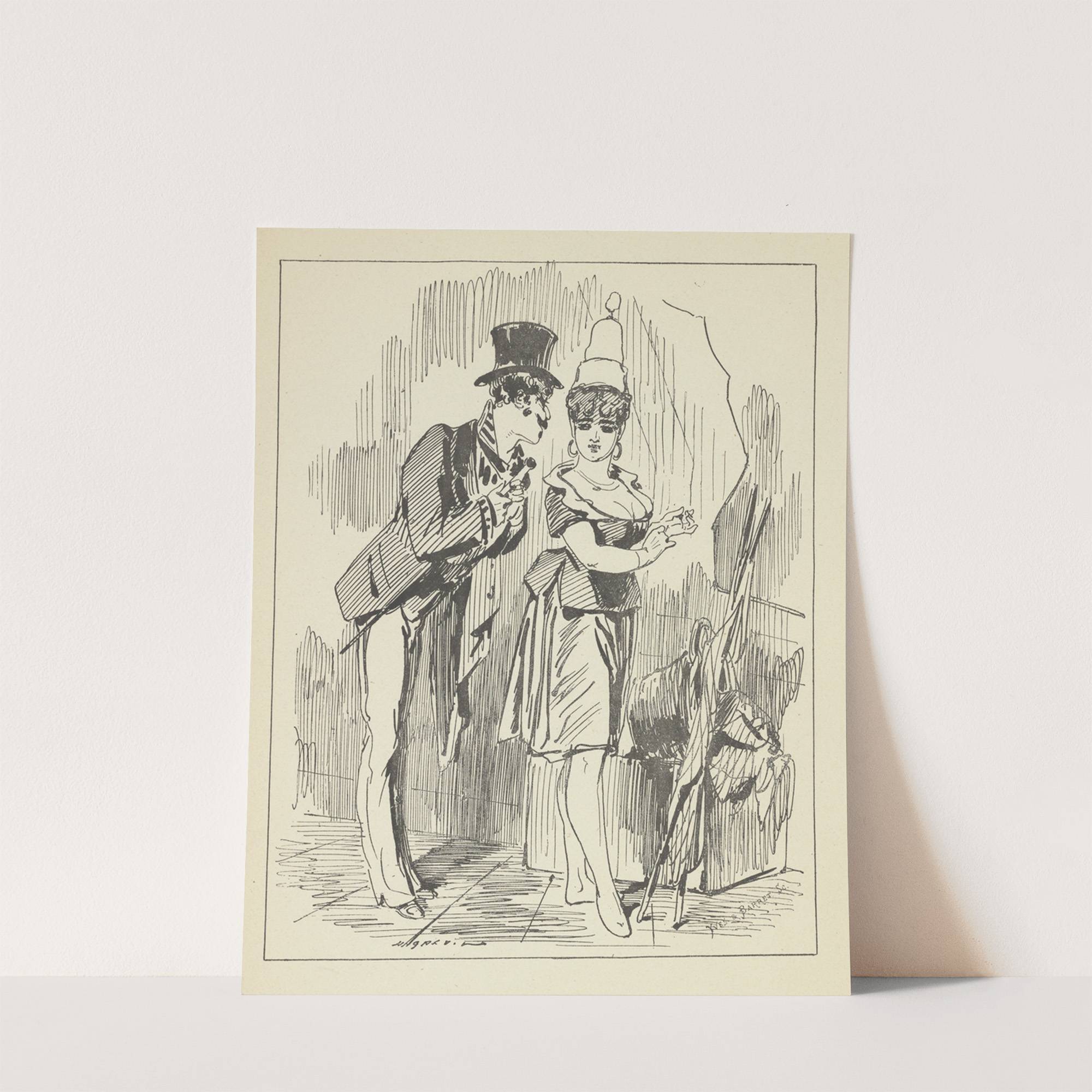This black-and-white illustration by Alfred Grévin captures a vintage scene titled "Les Coulisseurs" from the late 19th century. The detailed line work creates a sense of movement and depth, drawing the viewer's eye to two central figures. On the left...