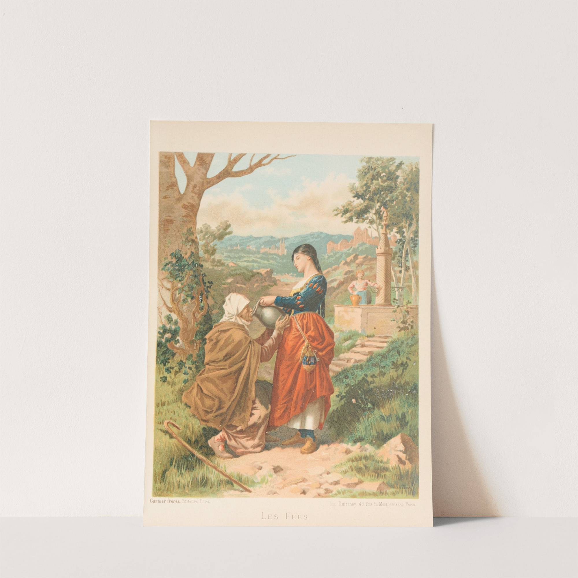 This beautifully illustrated print titled "Les Fees" by A. Guillon features two figures set in a lush, idyllic landscape. In the foreground, a cloaked figure with a white headscarf kneels slightly towards the right, receiving a silver flask from a...