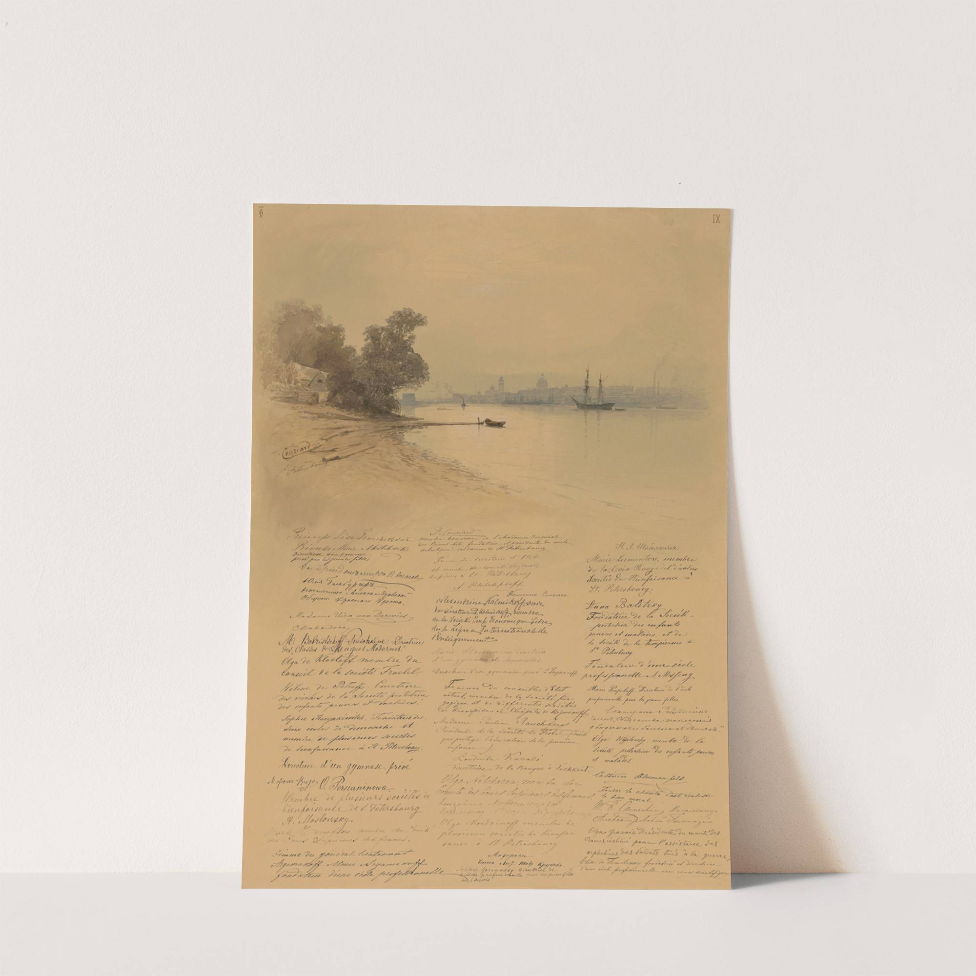This art print features an exquisite watercolor painting of a serene riverscape titled "Les Femmes russes aux femmes de France Pl.10" created by Elena Dmitrievna Polenova in 1894. The scene is bathed in soft, warm tones of yellow and beige,...