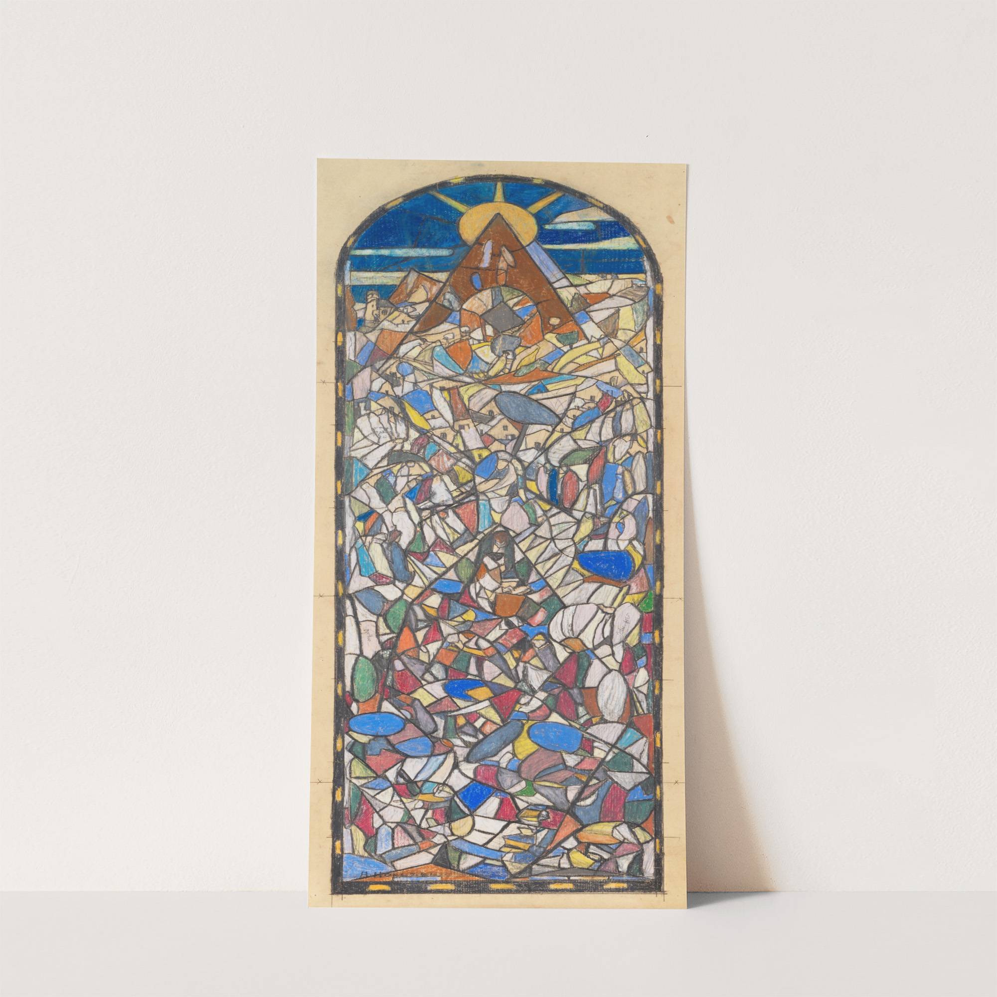 This vibrant artwork is titled "Lesende (Glasfensterentwurf)" by the renowned artist Adolf Hölzel. It features an intricate stained glass design, meticulously crafted with a plethora of colorful fragments that create a visually striking and dynamic composition. The piece employs a...
