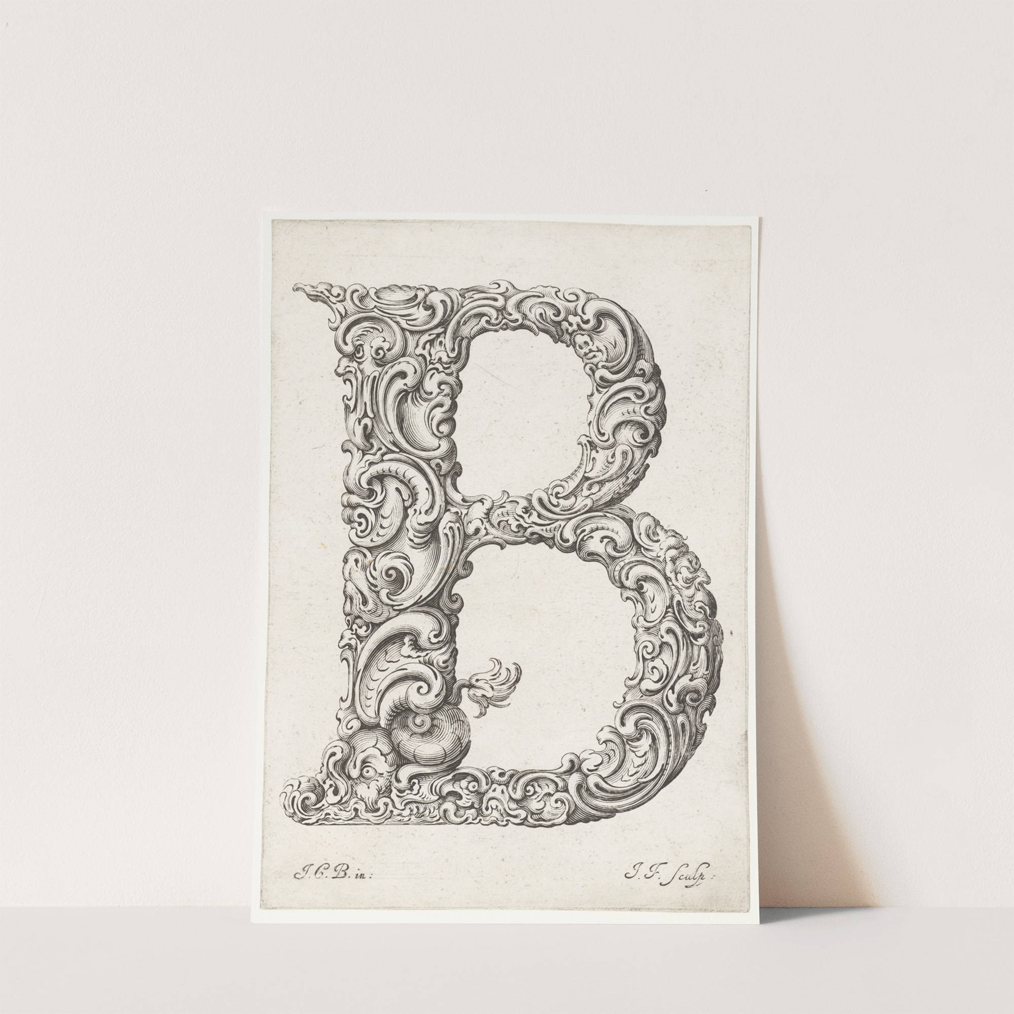This exquisite art print showcases a beautifully intricate black-and-white letter "B" crafted in an elaborate Baroque style. The design features complex, swirling patterns that resemble ornate carvings or delicate lacework, filled with curling vines and elegant motifs typical of 17th-century...