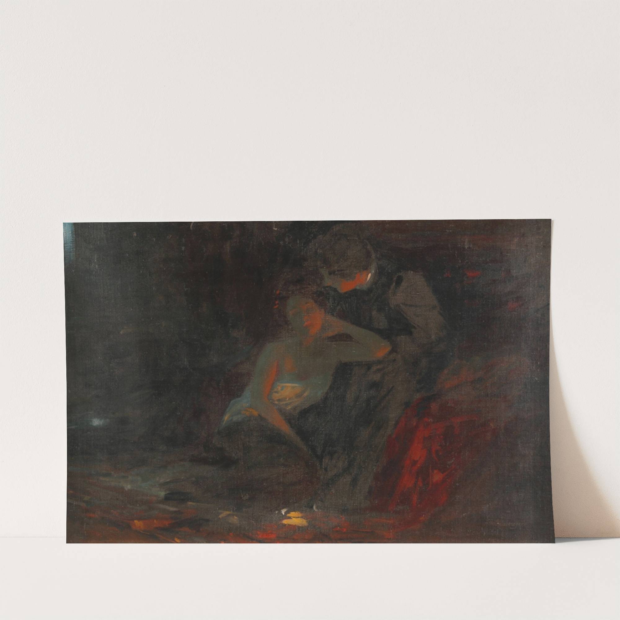 This captivating art print features "Liebespaar" by Albert Ritzberger, showcasing an intimate and evocative scene rendered in rich, dark hues with subtle highlights of red and orange. The painting depicts a tender moment between two figures: a man and a...
