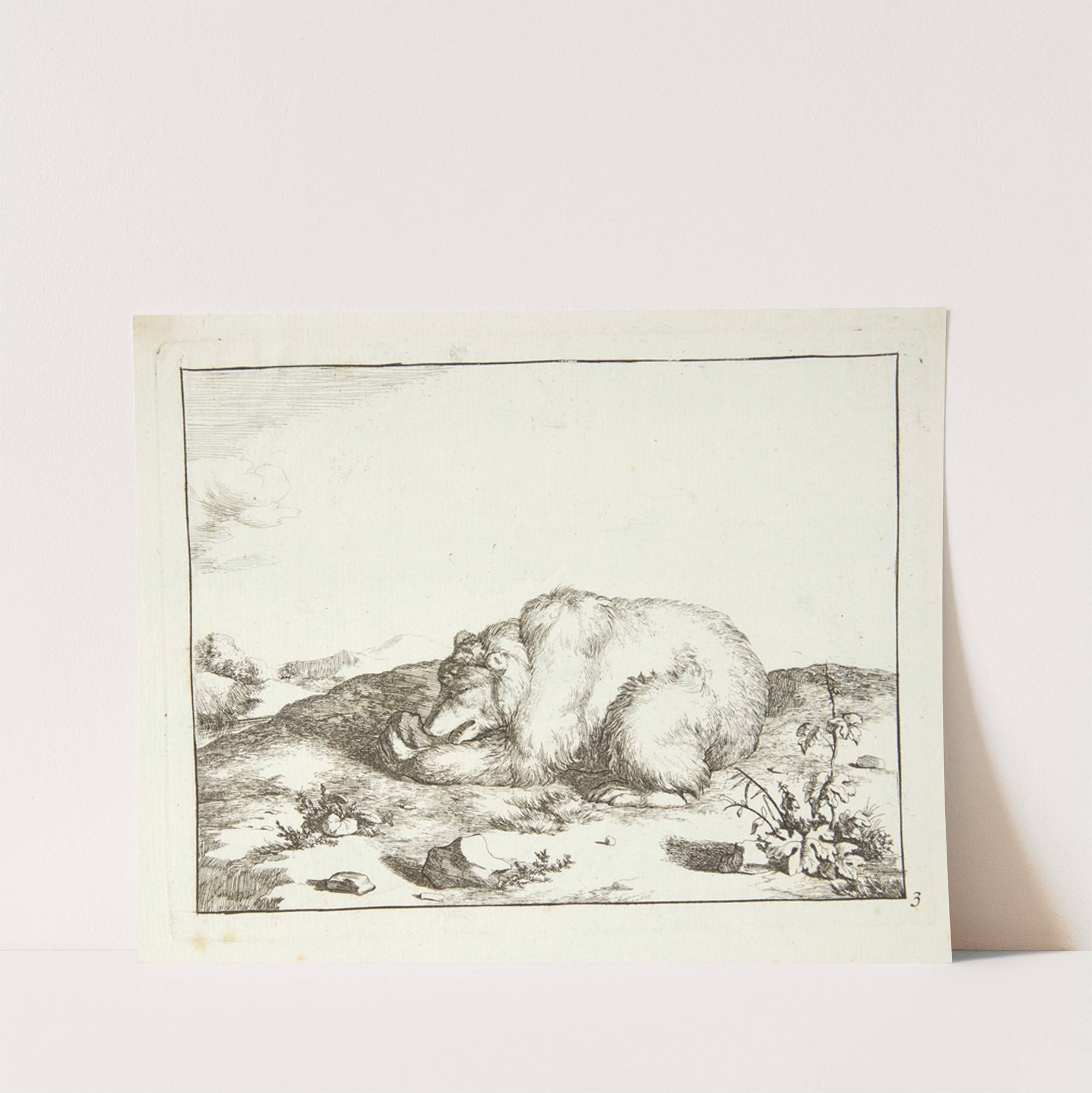 Liggende bjørn, der spiser noget fra sin venstre pote by Marcus de Bye - Wall Art Print