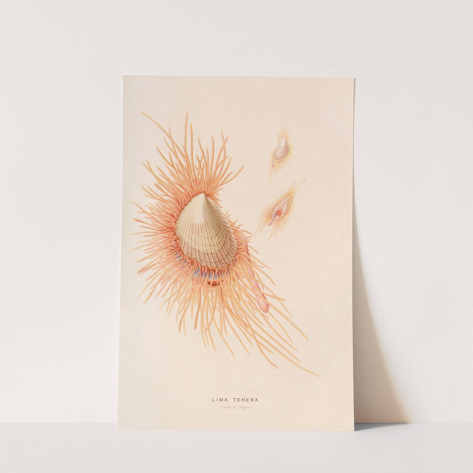 Explore the captivating artistry of "Lima Tenera" by Alfred Frédol, a digital illustration that brings a sense of wonder to any space. The centerpiece features an intricately detailed seashell with delicate, textured ridges in a soft beige hue, resembling a...