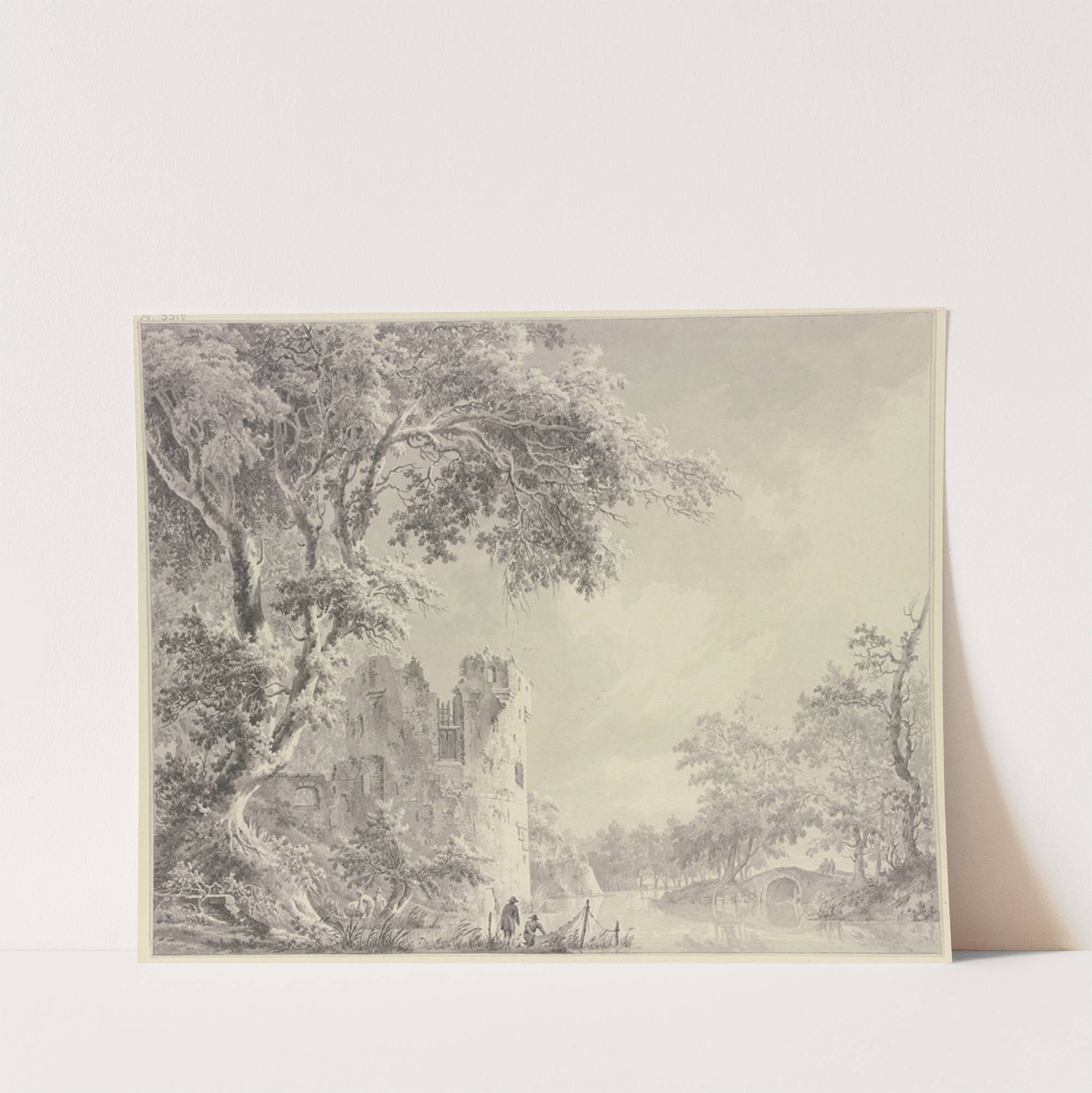 Links eine Turmruine am Wasser, rechts eine Brücke, vorne zwei Fischer bei einem Netz by Paulus van Liender - Wall Art Print