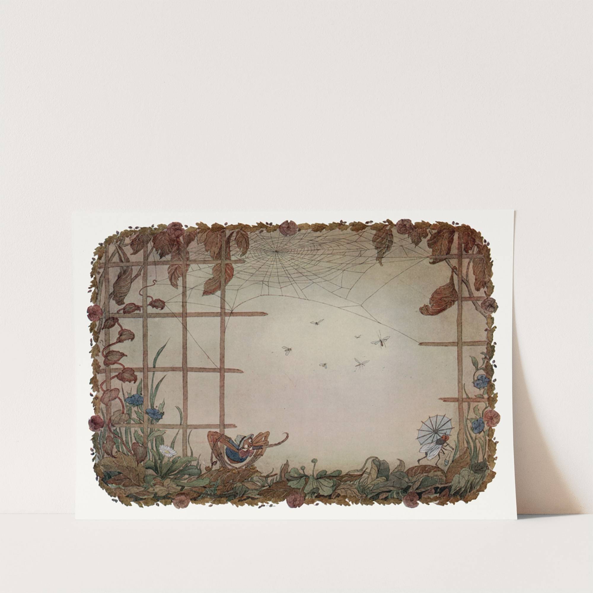 This enchanting art print features "Little Songs of Long Ago" (1912) by Henriëtte Willebeek Vremse. It captures a dreamy, nature-inspired scene with intricate details and rich colors. The composition includes a delicate spider web spanning the upper section, with tiny...