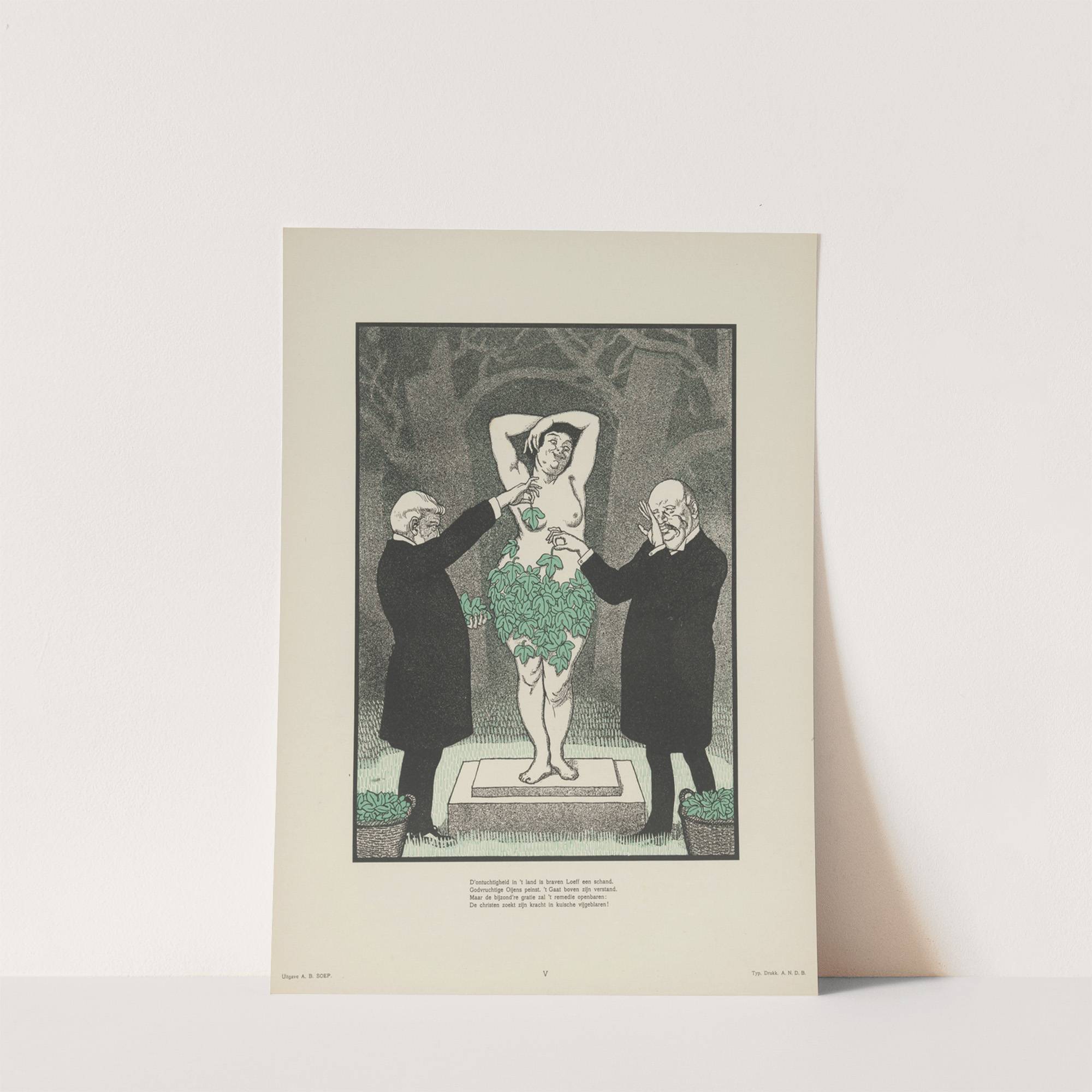 This art print features "Loeff en Oyens" by Albert Hahn, showcasing an intriguing and expressive composition. At the center of the image is a woman standing on a pedestal with one arm raised behind her head and the other hand...