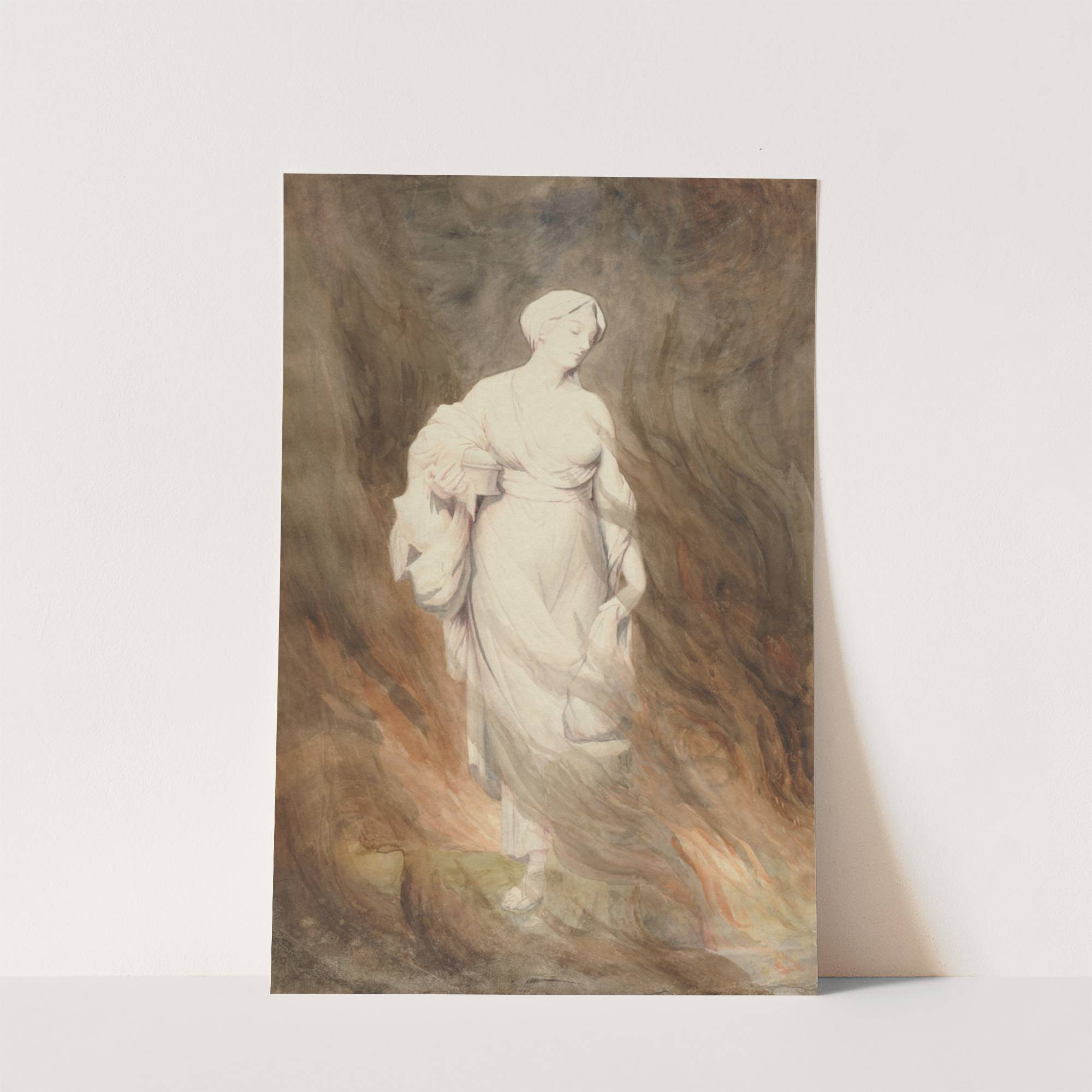 This elegant artwork features "Lot's Wife," a classical sculpture rendered in a dreamy, ethereal style. The figure is depicted standing with a serene expression, her body slightly forward as if stepping out of the shadows. Her attire consists of flowing,...