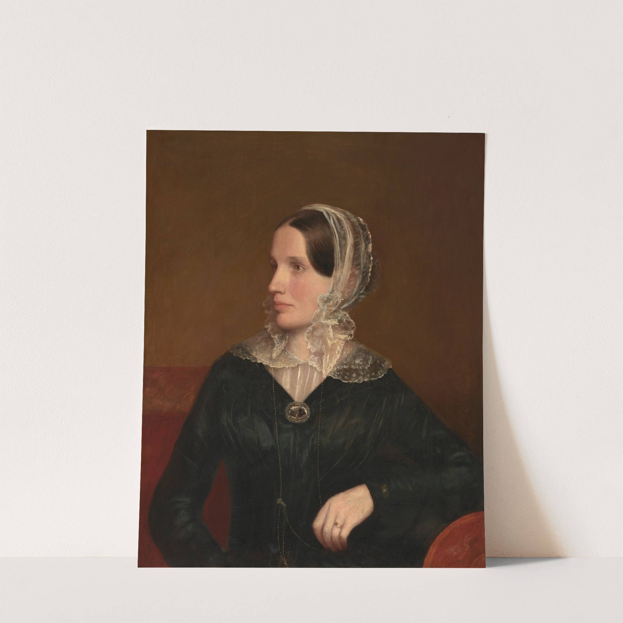 This refined portrait, "Lovice Corbett Whittemore (1845) by Alvan Clark," showcases an exquisite oil painting of a Victorian woman. She is depicted in profile against a rich brown backdrop that enhances her solemn expression and elegant demeanor. Her dark hair...
