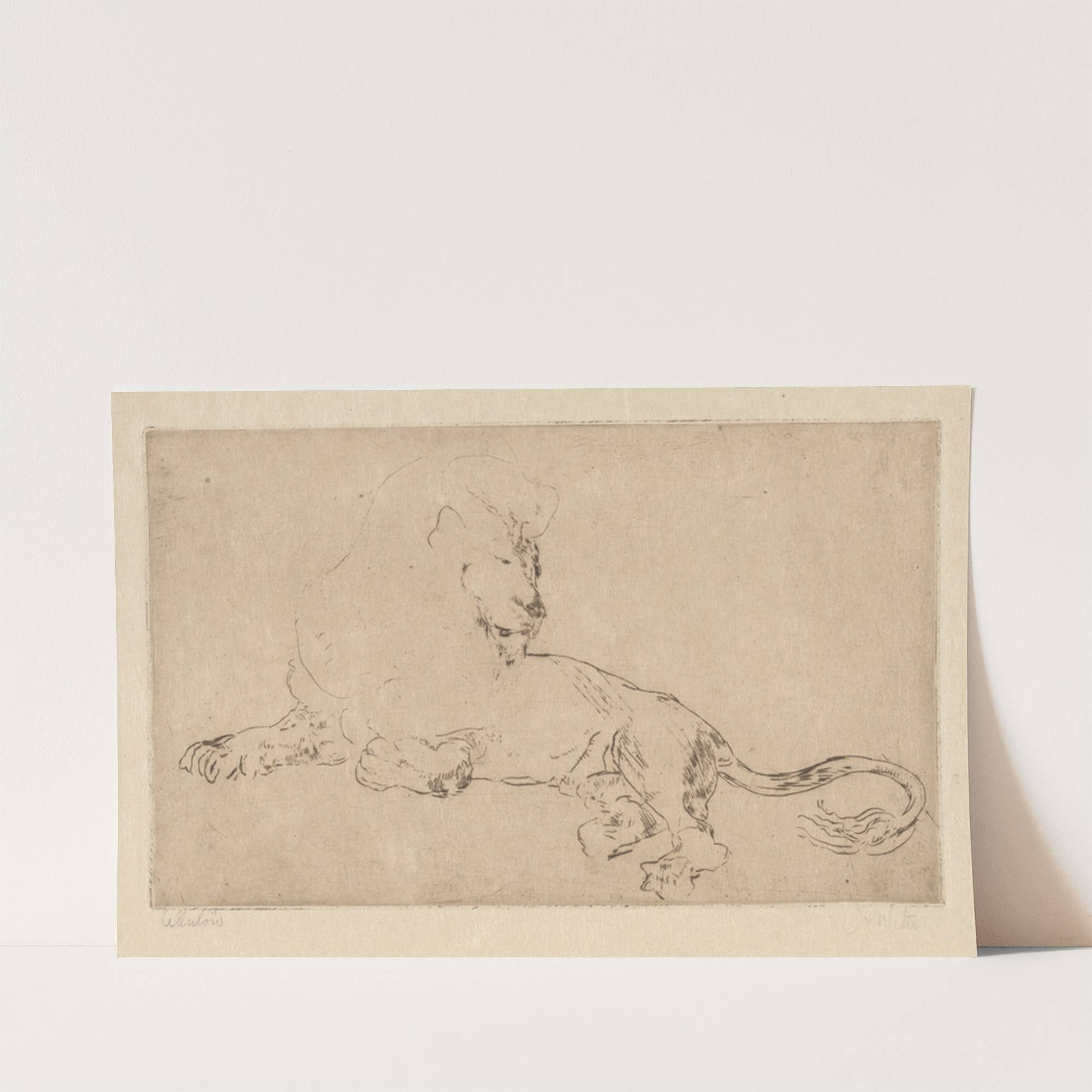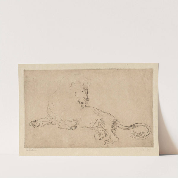 This art print features "Löwenstudie" (1910) by Albert Welti, rendered in a delicate, monochromatic pencil sketch style. The subject of the piece is a lion, captured in a dynamic and relaxed pose, with one foreleg extended gracefully while its body...