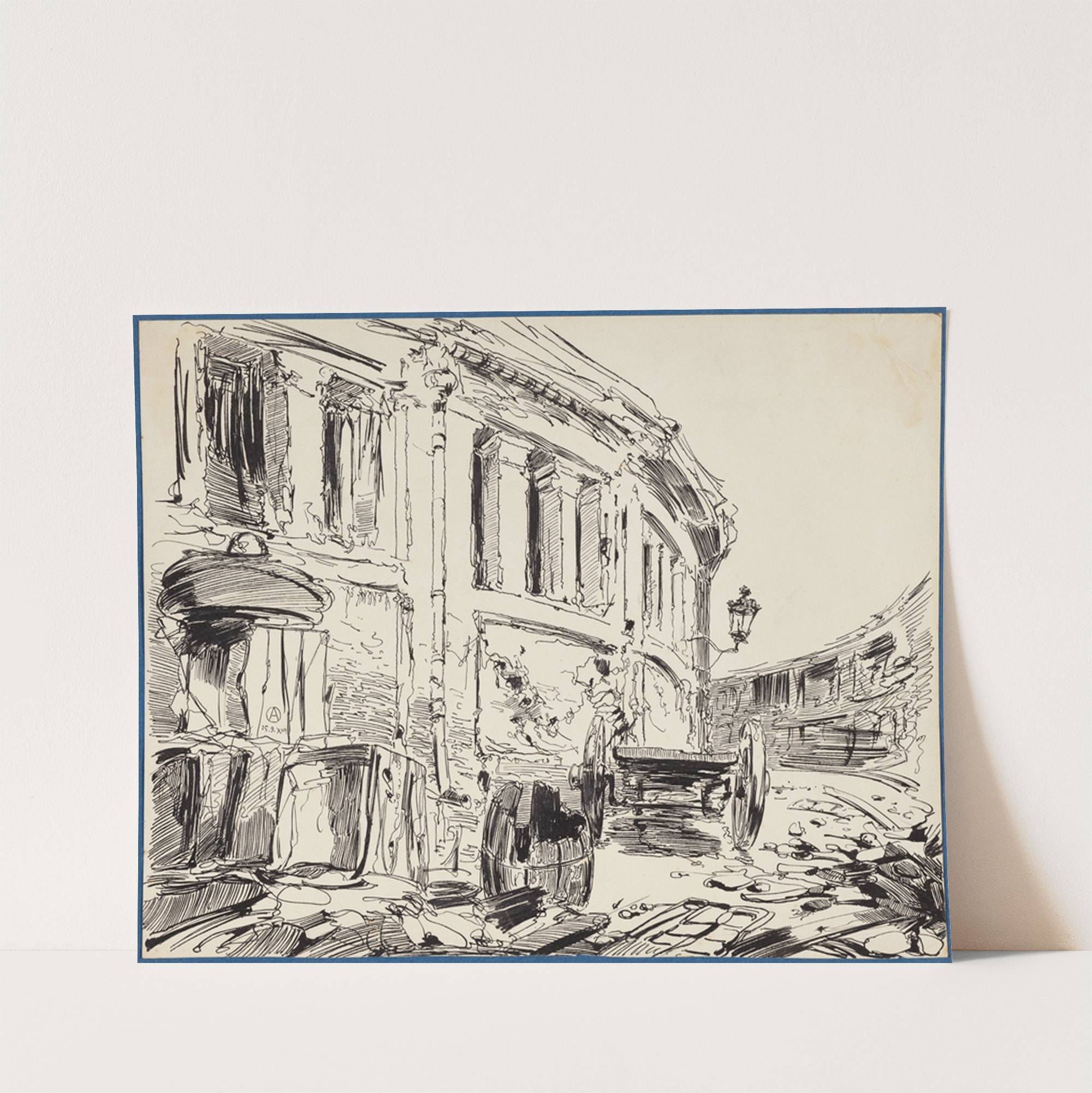 This black-and-white line drawing features a classic European building from the early 20th century, rendered with dynamic, expressive strokes that give it a sense of movement and depth. The building has large windows framed with classical columns and intricate architectural...