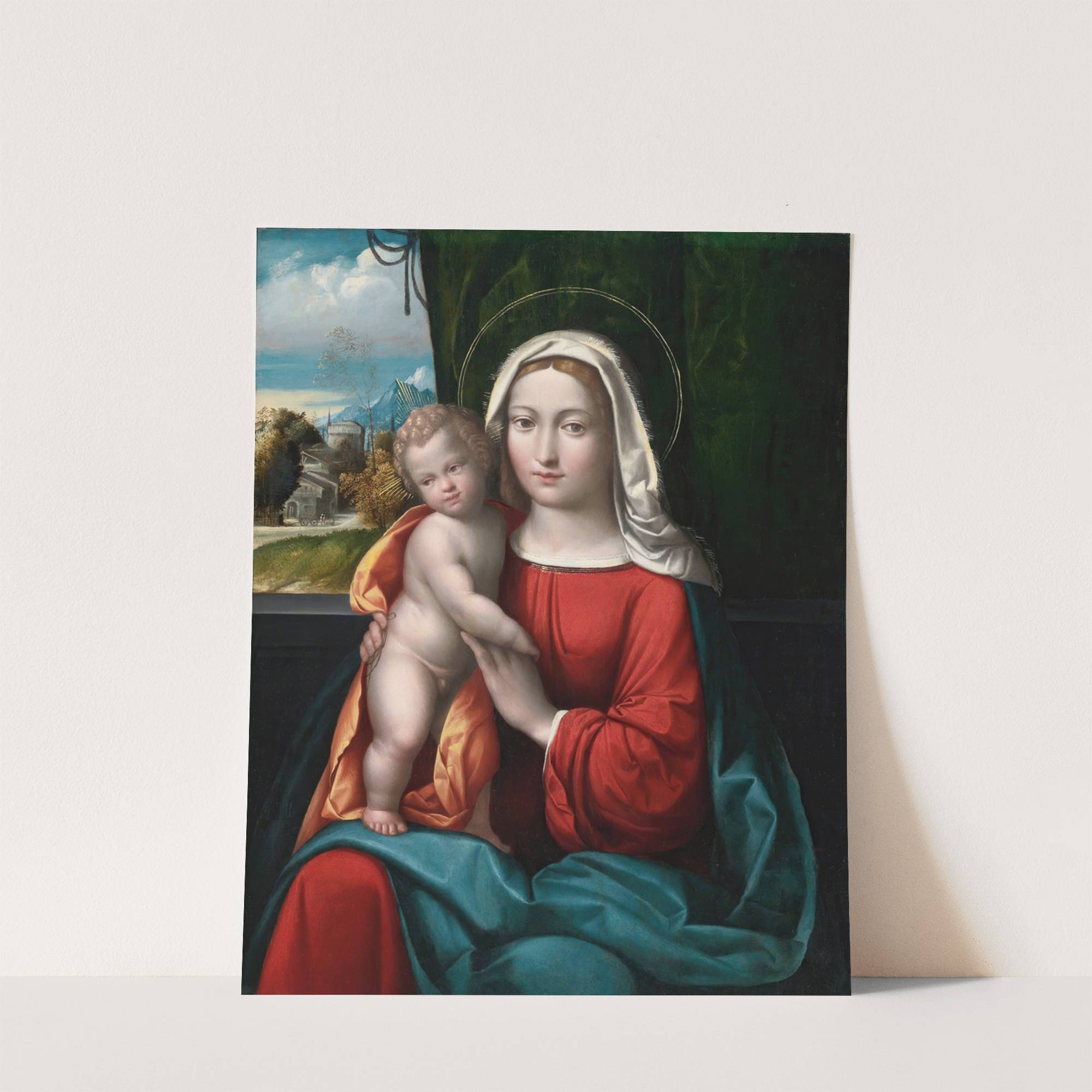 Madonna And Child Before A Curtain, A Mountainous Landscape Beyond by Benvenuto Tisi - Wall Art Print