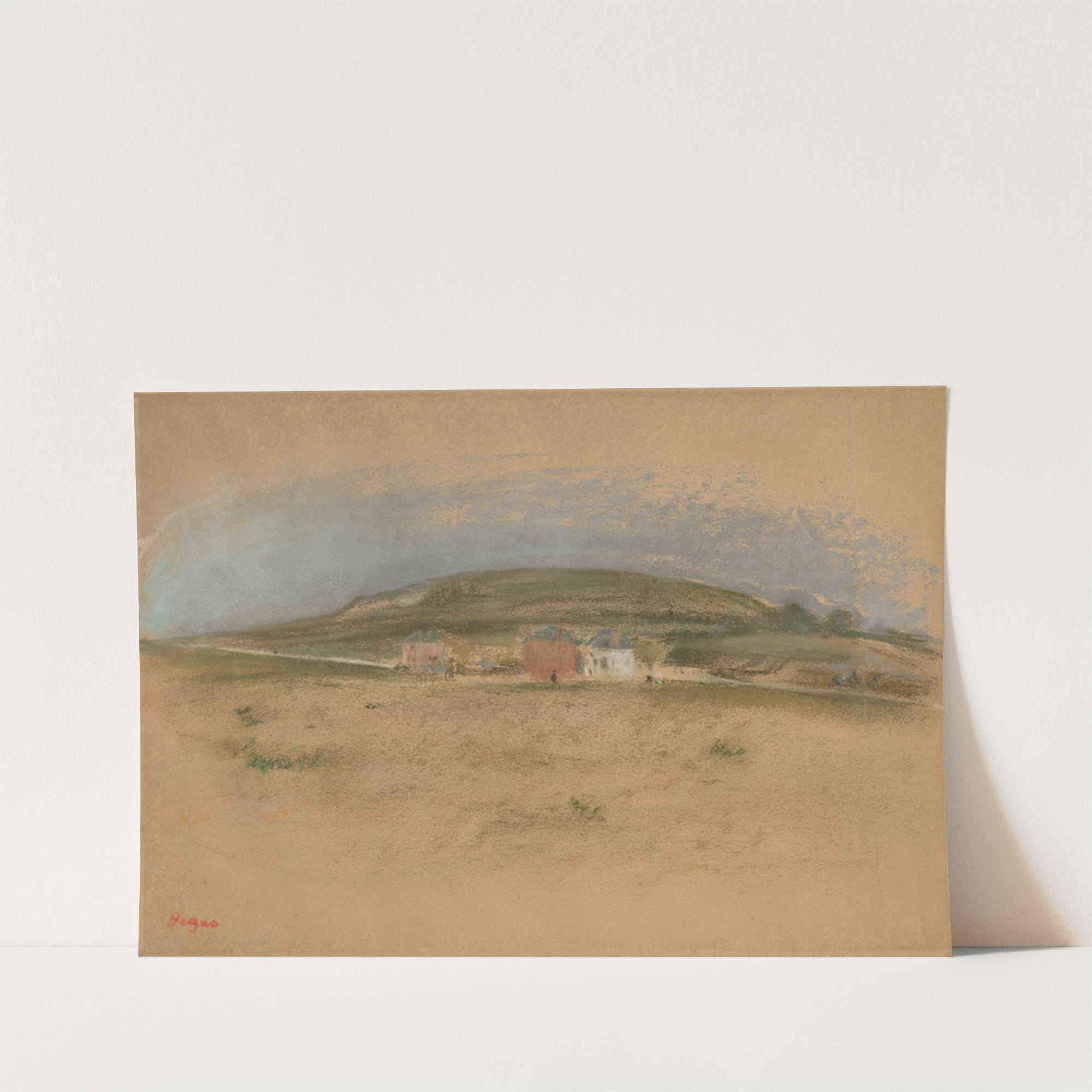 This evocative landscape print captures the serene beauty of rural countryside in "Maisons au pied d'une falaise" by Edgar Degas. The painting employs a soft, earthy palette dominated by warm beige tones that blend seamlessly with the muted greens and...