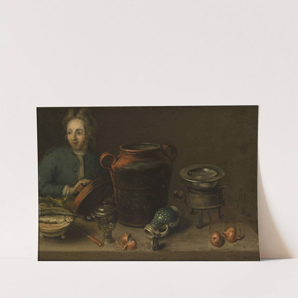 This classical still life painting titled "Man in the Kitchen" by Andreas Held captures a serene yet vibrant scene with meticulous attention to detail. The composition features a man with pale skin and soft facial features, dressed in dark clothing...