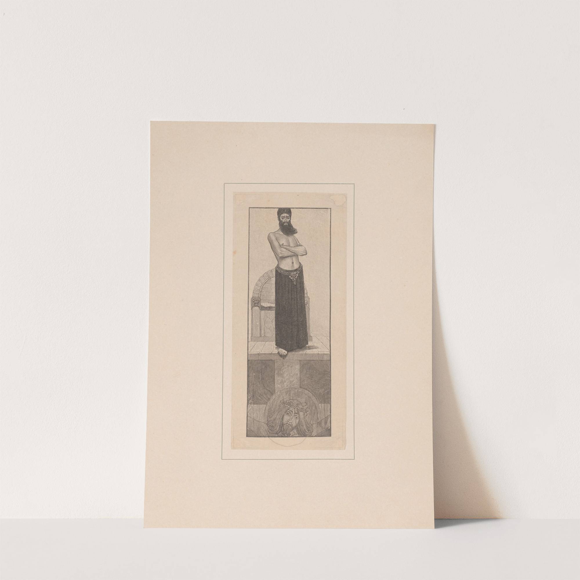 This exquisite print showcases "Man met baard voor een troon boven Christus aan het kruis" by Johann Jakob Weber, a masterful piece of Art Nouveau style. The central figure is a bearded man standing confidently on an elevated platform, his...