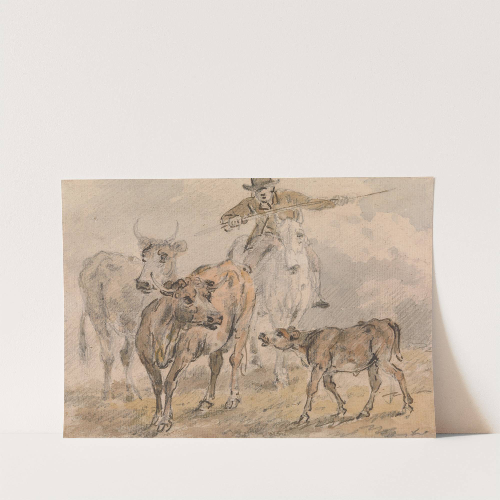 Man on a horse hearding two cows and a calf by Sawrey Gilpin - Wall Art Print