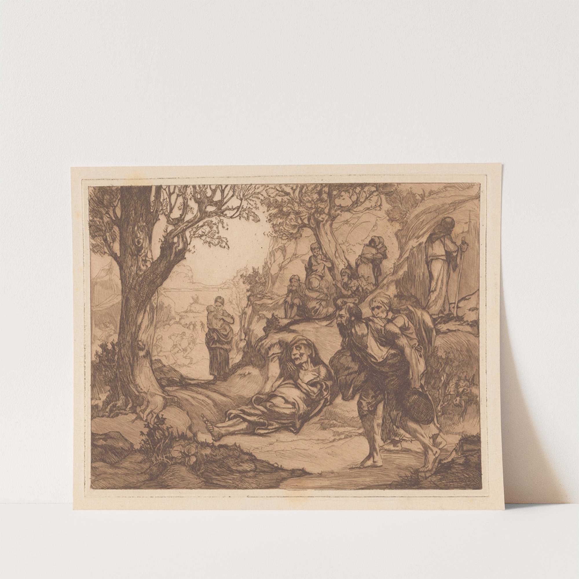 Mannen, vrouwen en kinderen in heuvelachtig landschap by Johannes Josephus Aarts - Wall Art Print