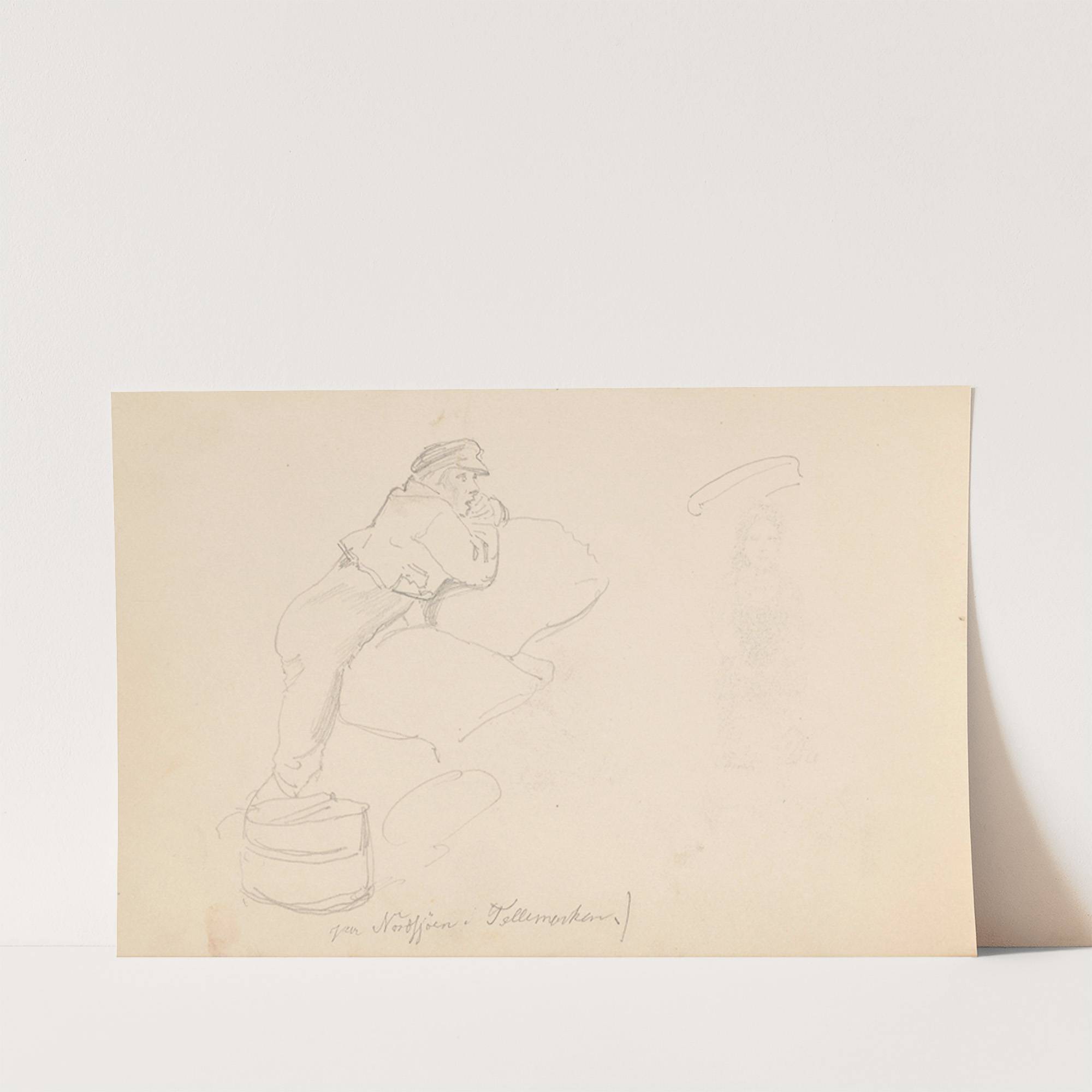 This art print showcases "Mannsfigur, Norsjø i Telemark" by Adolph Tidemand, a delicate monochromatic line drawing. The image features a loosely sketched figure in profile, seemingly engaged in an activity at the water's edge. The lines are gentle yet precise,...